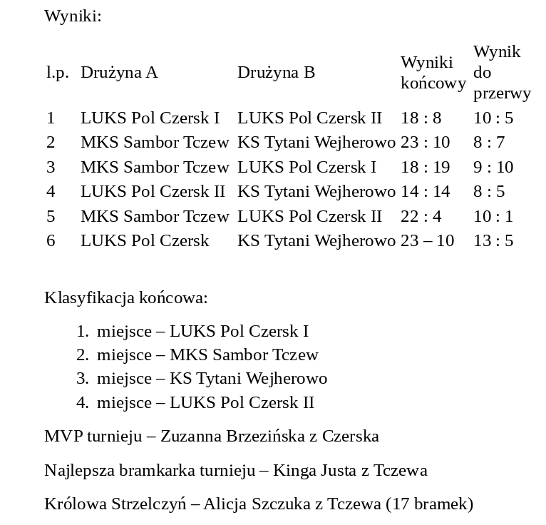 Organizatorzy turnieju – LUKS Pol Czersk oraz Hala Sportowa im. Romana Bruskiego w Czersku – składają serdeczne podziękowania osobom, które wsparły wydarzenie: R. Cisewskiemu, Milenie Czapiewskiej, Adrianie Żabińskiej, Kornelii Łąckiej oraz Marcinowi Lindzie za pomoc w przygotowaniu i przeprowadzeniu zawodów.