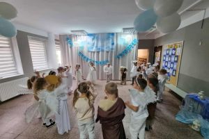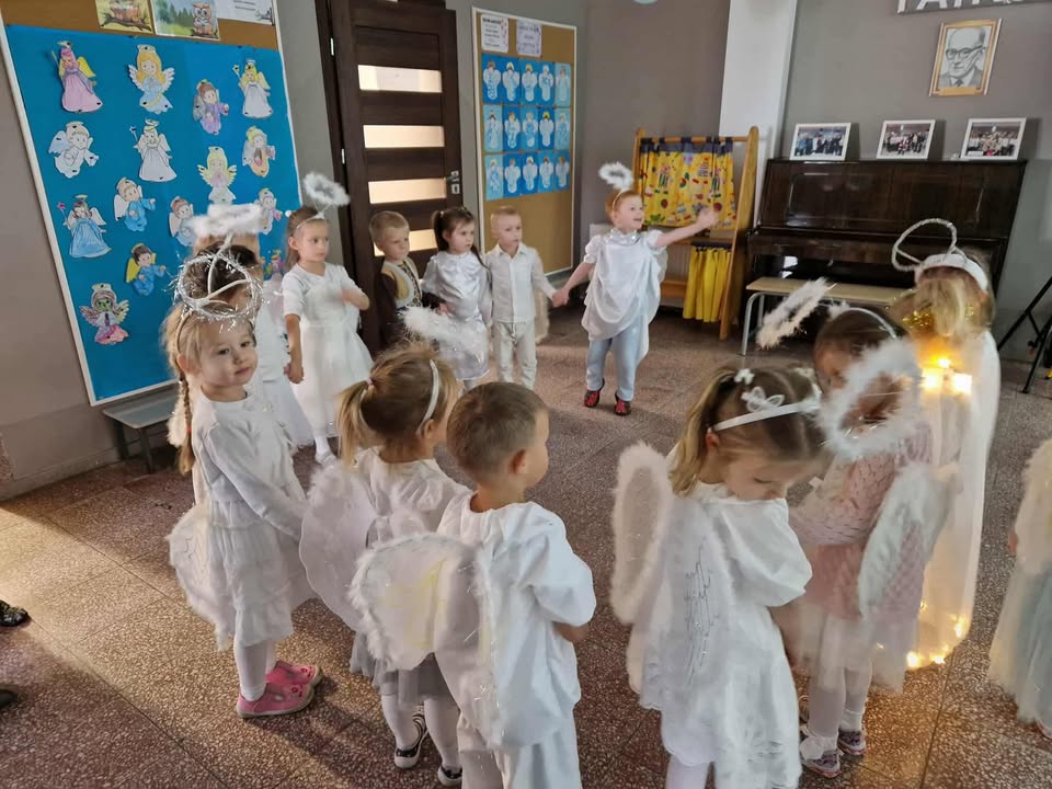 Wśród licznych Aniołków pojawiły się postacie różnych Świętych – dziękujemy Rodzicom za przygotowanie tak pięknych strojów! Nasze przedszkole zamieniło się w miejsce wspólnej zabawy, śpiewu, tańców i integracji. Atmosfera radości i wzajemnej życzliwości towarzyszyła wszystkim przedszkolakom od początku do końca. 🌈