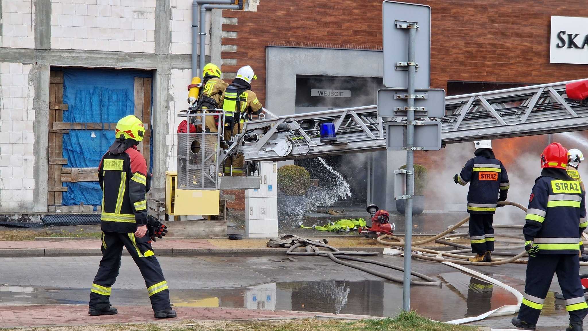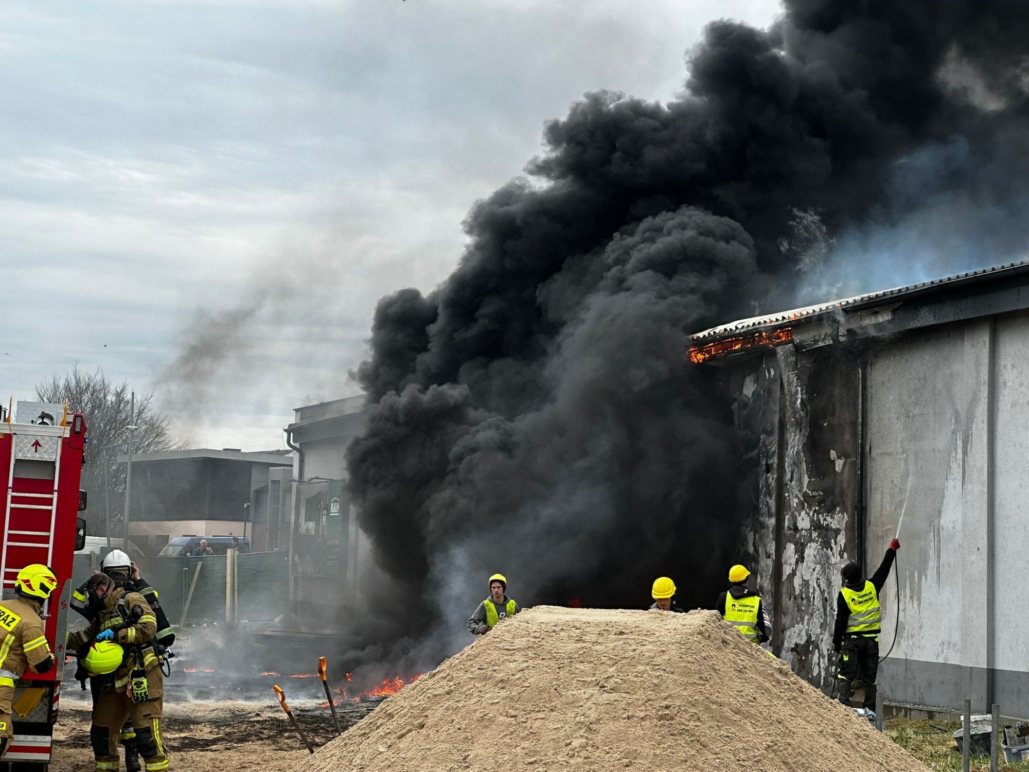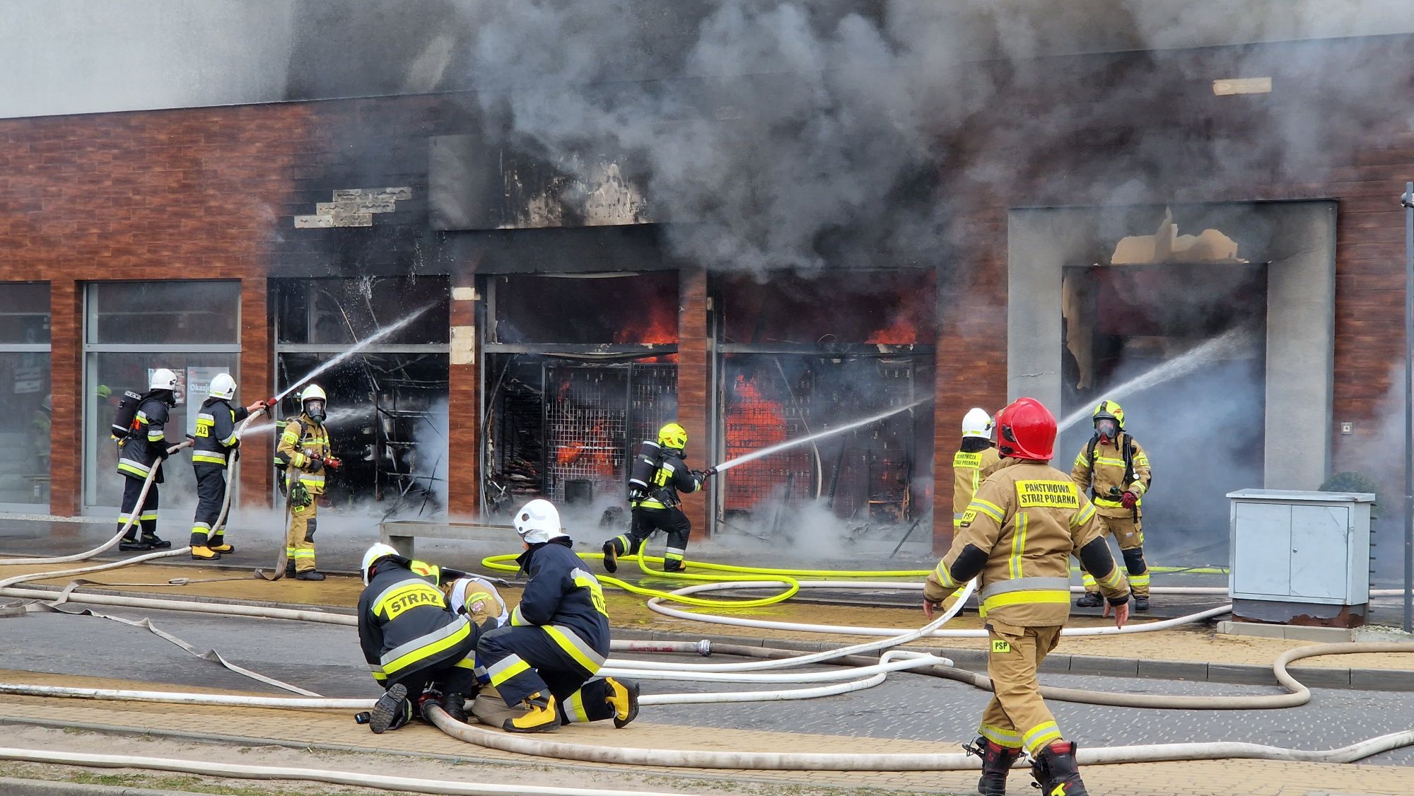 Na miejscu pracują liczne służby ratunkowe, które prowadzą intensywną akcję gaśniczą. Nad okolicą unosi się gęste zadymienie, widoczne z dużej odległości. Na miejscu zdarzenia pracuje ponad 20 zastępów straży pożarnej, w tym specjalistyczna grupa ratownictwa chemicznego oraz samochód „gaz”. Łącznie działania prowadzi około 60 strażaków.