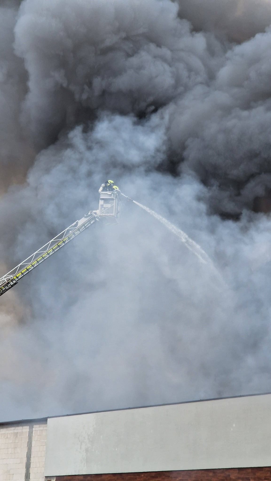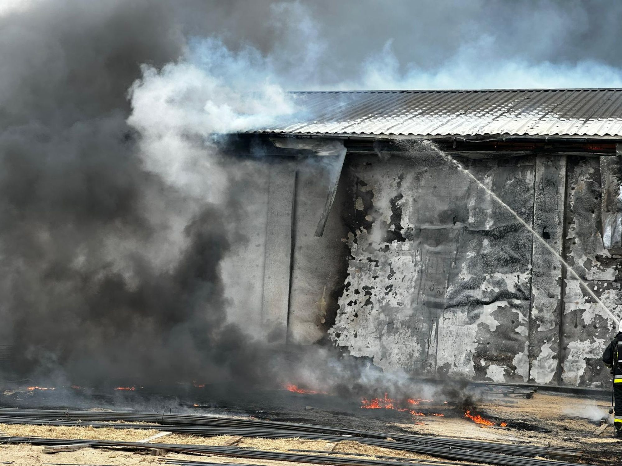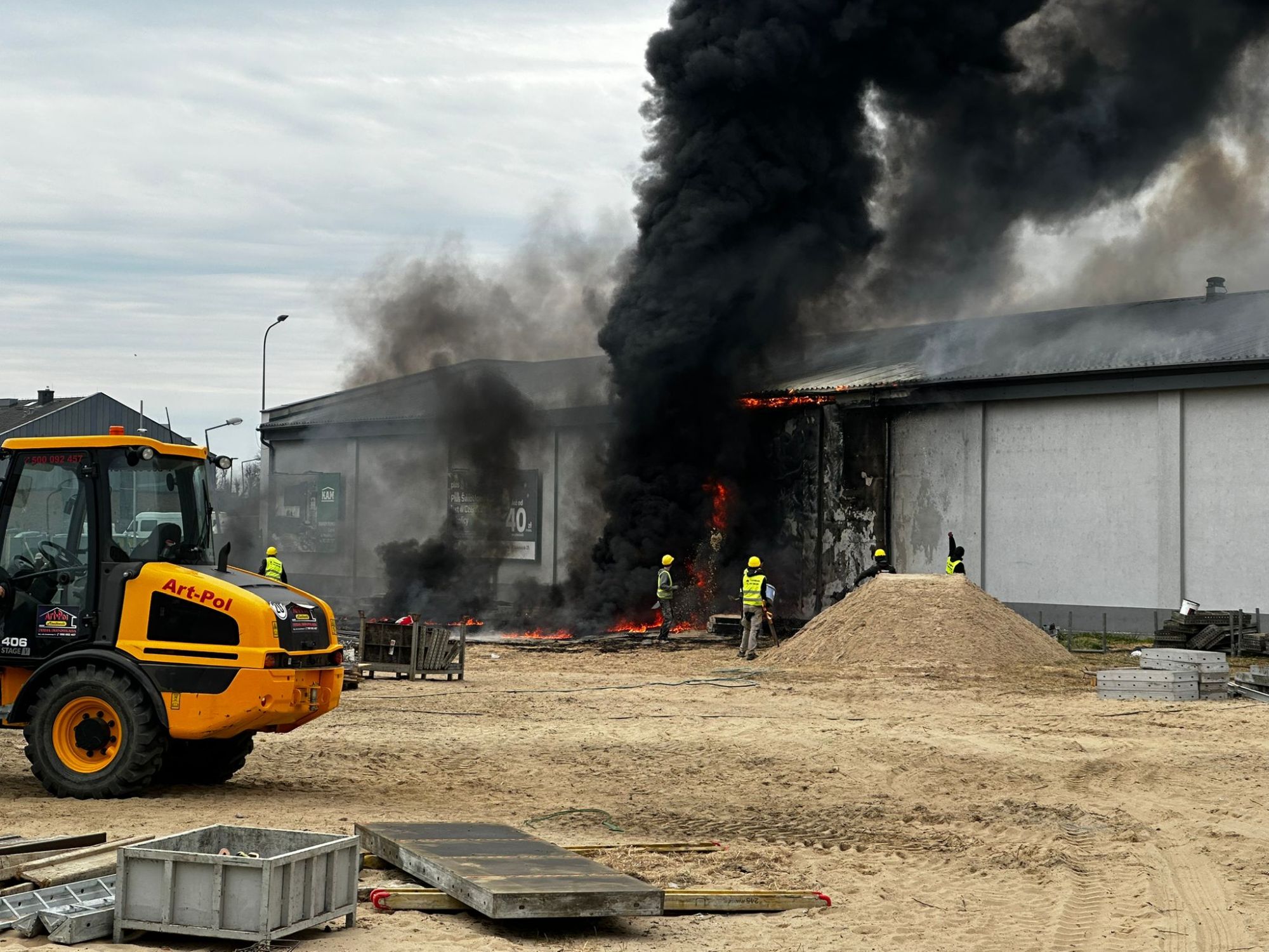 Na miejscu pracują liczne służby ratunkowe, które prowadzą intensywną akcję gaśniczą. Nad okolicą unosi się gęste zadymienie, widoczne z dużej odległości. Na miejscu zdarzenia pracuje ponad 20 zastępów straży pożarnej, w tym specjalistyczna grupa ratownictwa chemicznego oraz samochód „gaz”. Łącznie działania prowadzi około 60 strażaków.