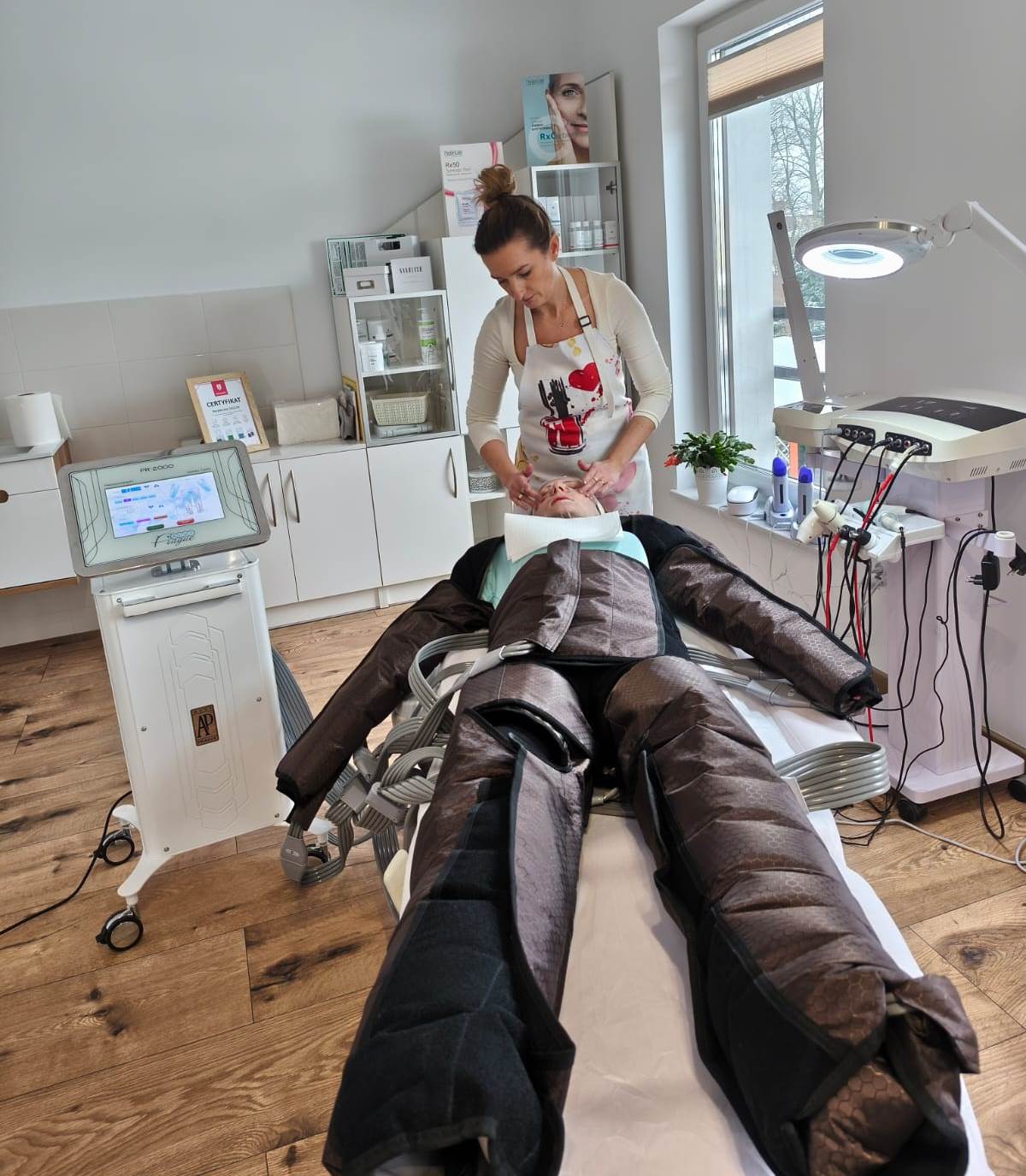Od niedawna w gabinecie wprowadziłam zabieg presoterapii. Jest to masaż uciskowy, będący rodzajem mechanicznego drenażu limfatycznego, który stymuluje krążenie krwi i limfy przy użyciu specjalnych mankietów napełnianych powietrzem. Zabieg jest bezbolesny i pozwala uzyskać efekt już po pierwszych sesjach.