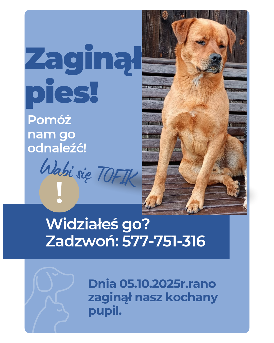 Bardzo proszę jeśli ktoś go zobaczy niech od razu do nas zadzwoni. Jak będzie możliwość to niech go zamknie u siebie na posesji, a my przyjedziemy od razu.