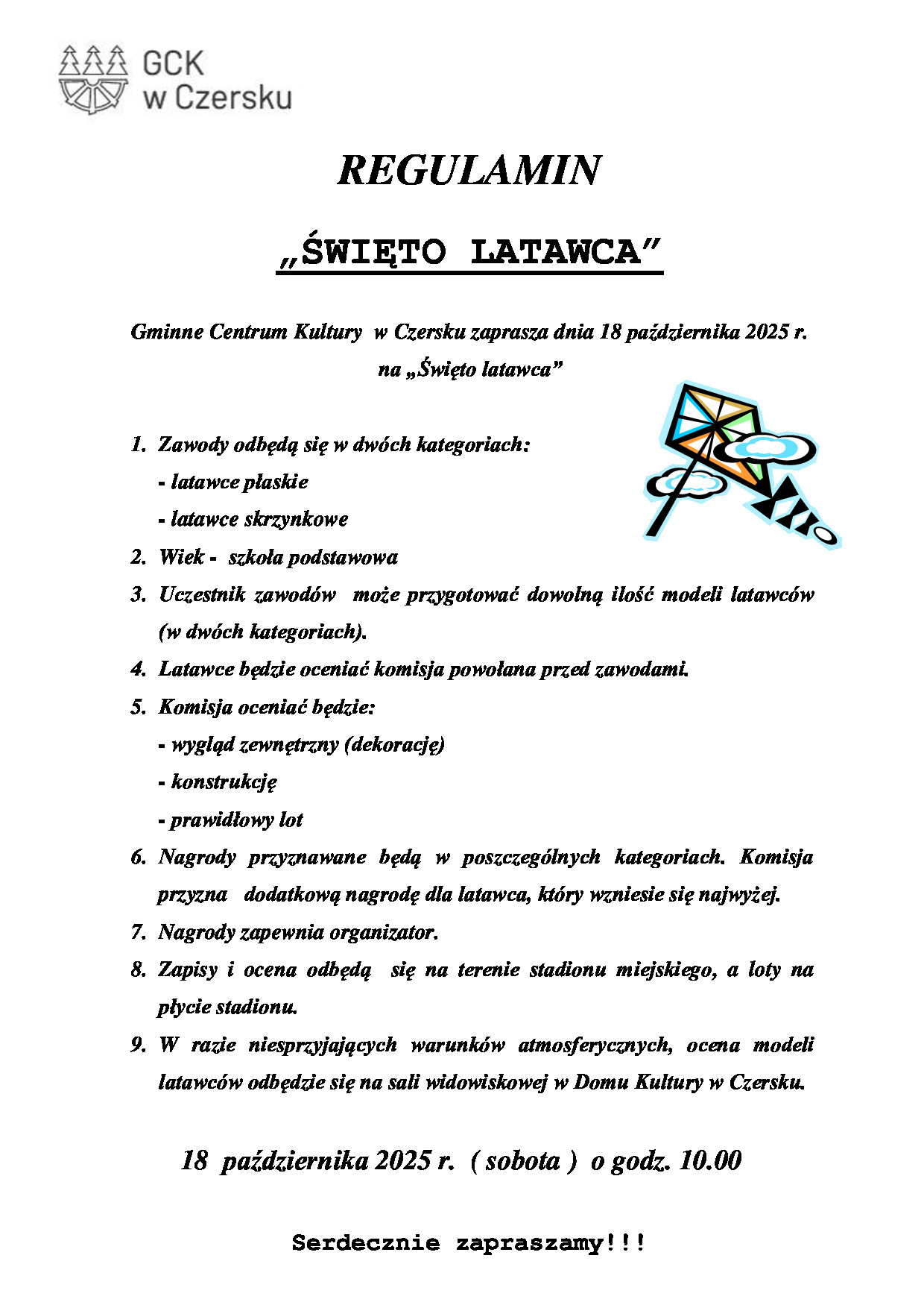 Już 18 października o godz. 10:00 spotykamy się na Stadionie Miejskim w Czersku, by wspólnie celebrować radość puszczania latawców! 🪁✨