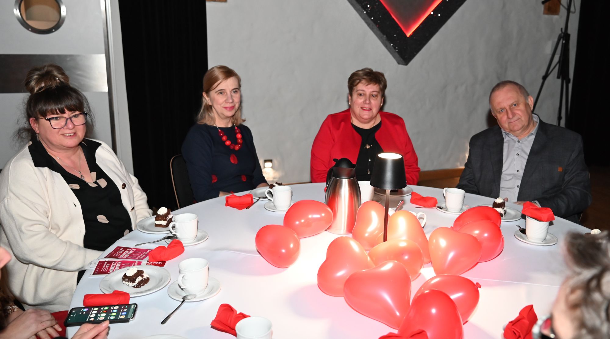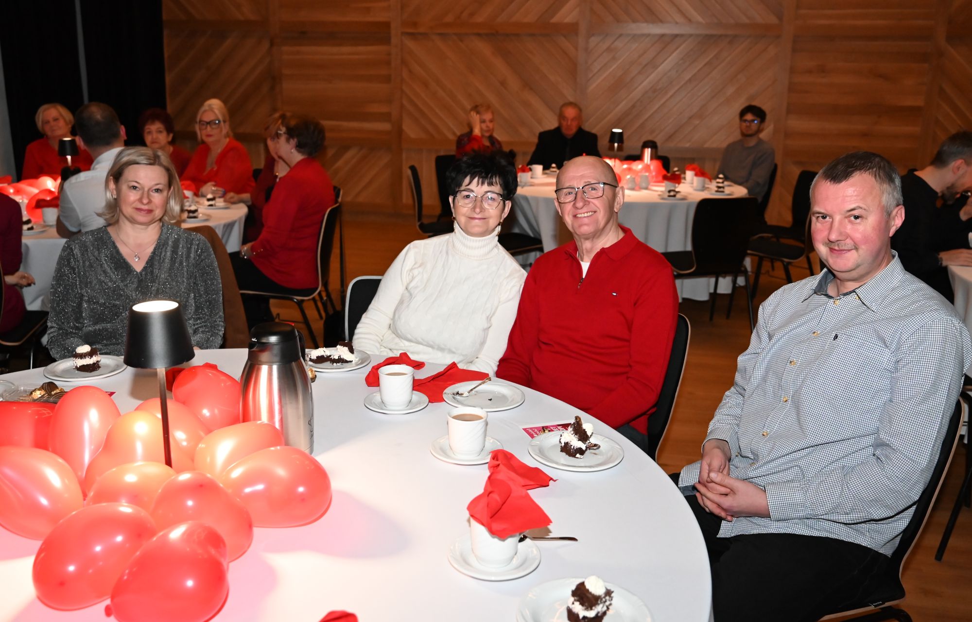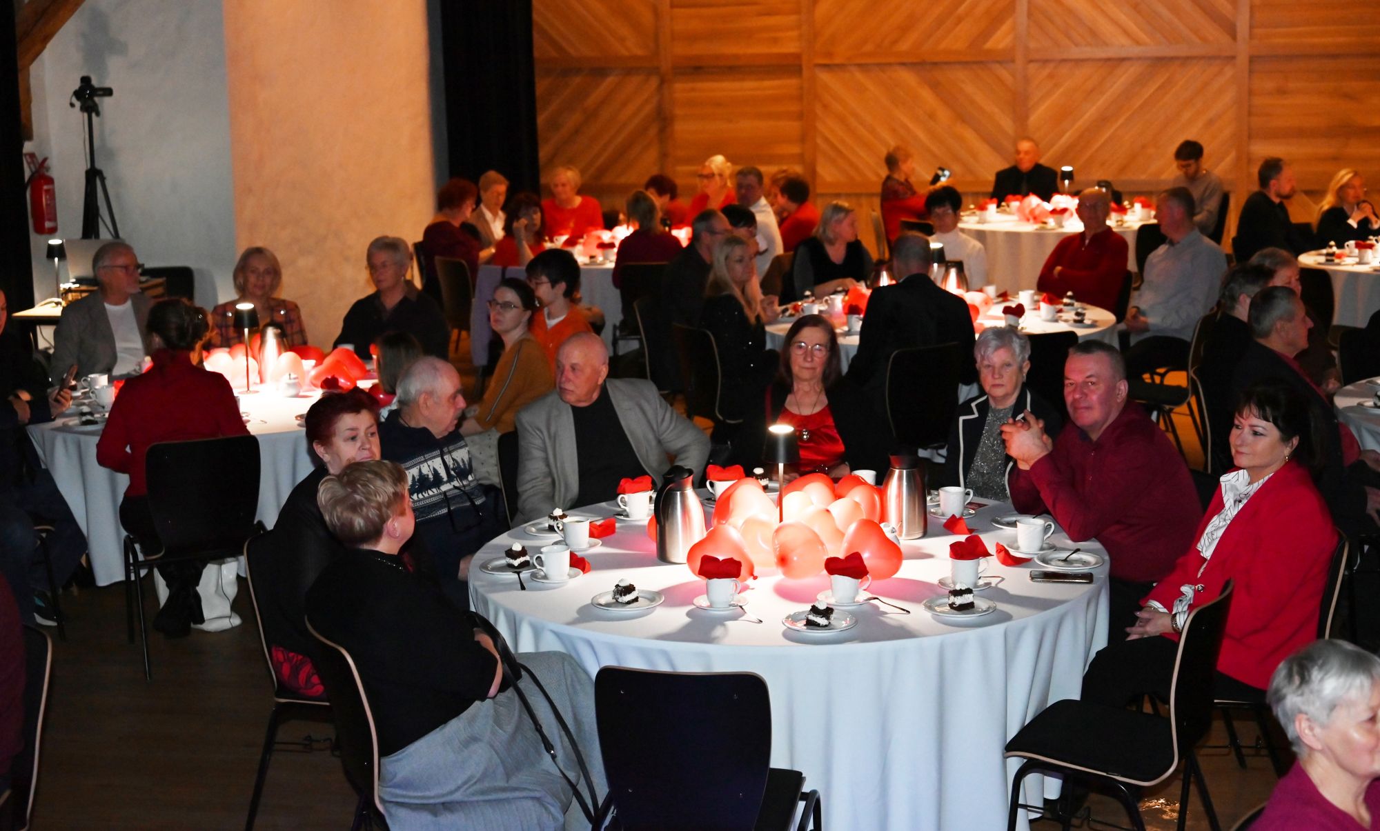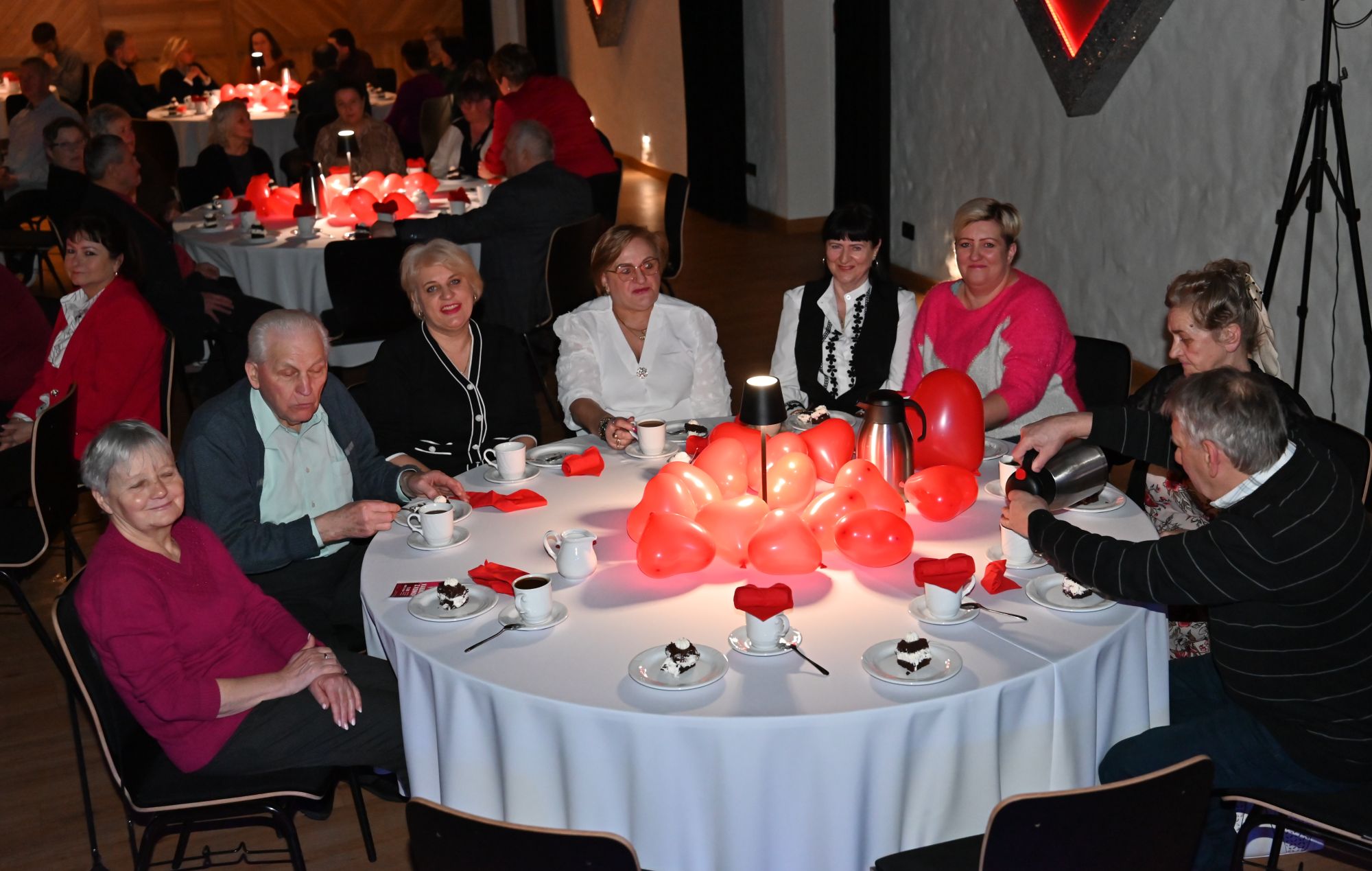 Uczestnicy wydarzenia zasiedli przy stolikach, delektując się kawą i wspólnie przeżywając muzyczne chwile w kameralnej, pełnej ciepła przestrzeni. Romantyczne brzmienia tworzyły nastrój sprzyjający rozmowom, uśmiechom i świętowaniu walentynek w spokojnej, artystycznej oprawie.