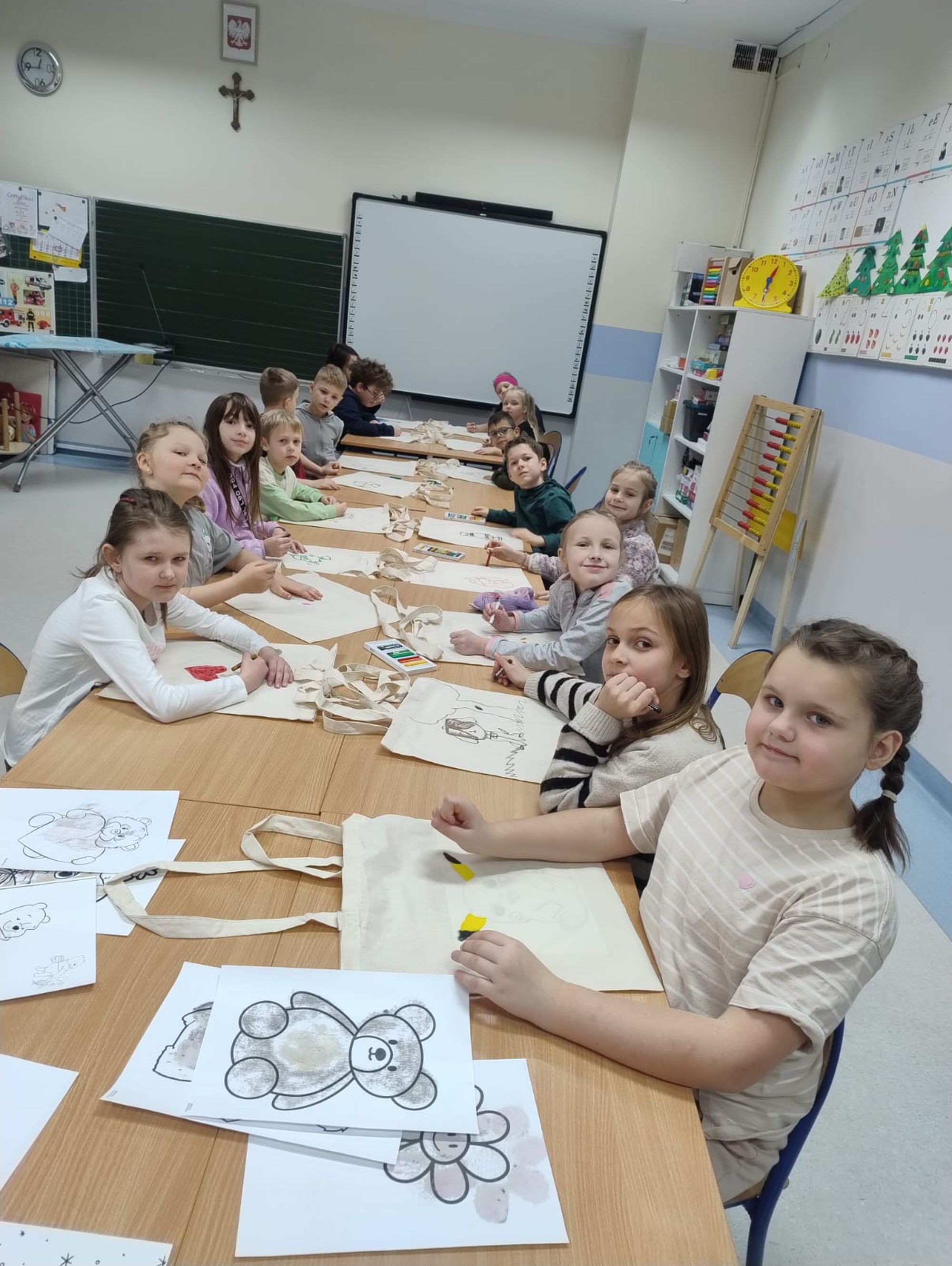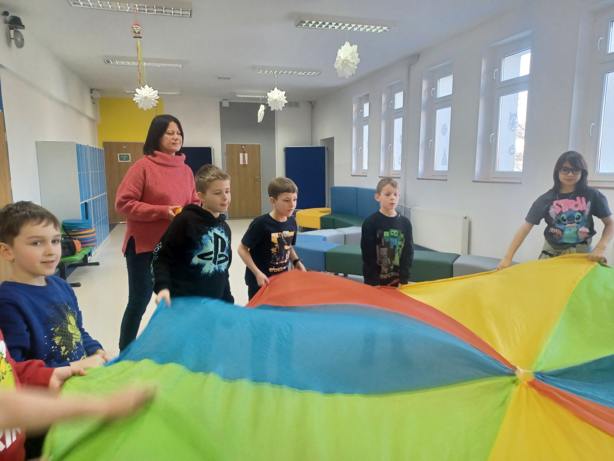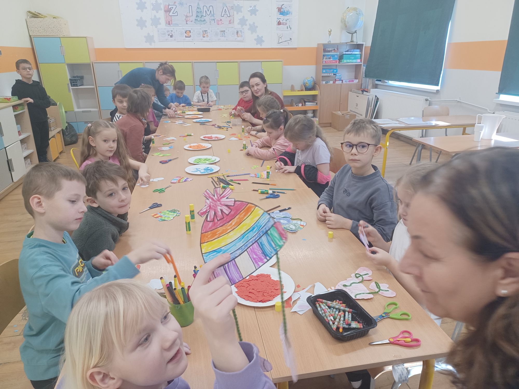 Każdy dzień zimowiska obfitował w nowe atrakcje. Poniedziałek rozpoczął się spotkaniem z panem Markiem Jasnochem – przedstawicielem Komisariatu Policji w Czersku, który przeprowadził pogadankę na temat bezpiecznego spędzania wolnego czasu. Następnie dzieci uczestniczyły w warsztatach artystycznych, podczas których wykazały się dużą kreatywnością, tworząc zimowe zestawy ubrań, ozdabiając czapki i rękawiczki z wykorzystaniem włóczki oraz materiałów papierniczych. W tym samym czasie inne grupy rozwijały umiejętności językowe, rozwiązywały zagadki, integrowały się podczas zabaw z chustą animacyjną i tunelem, a także wykonywały gliniane ozdoby i tworzyły przepiękne ptaszki.