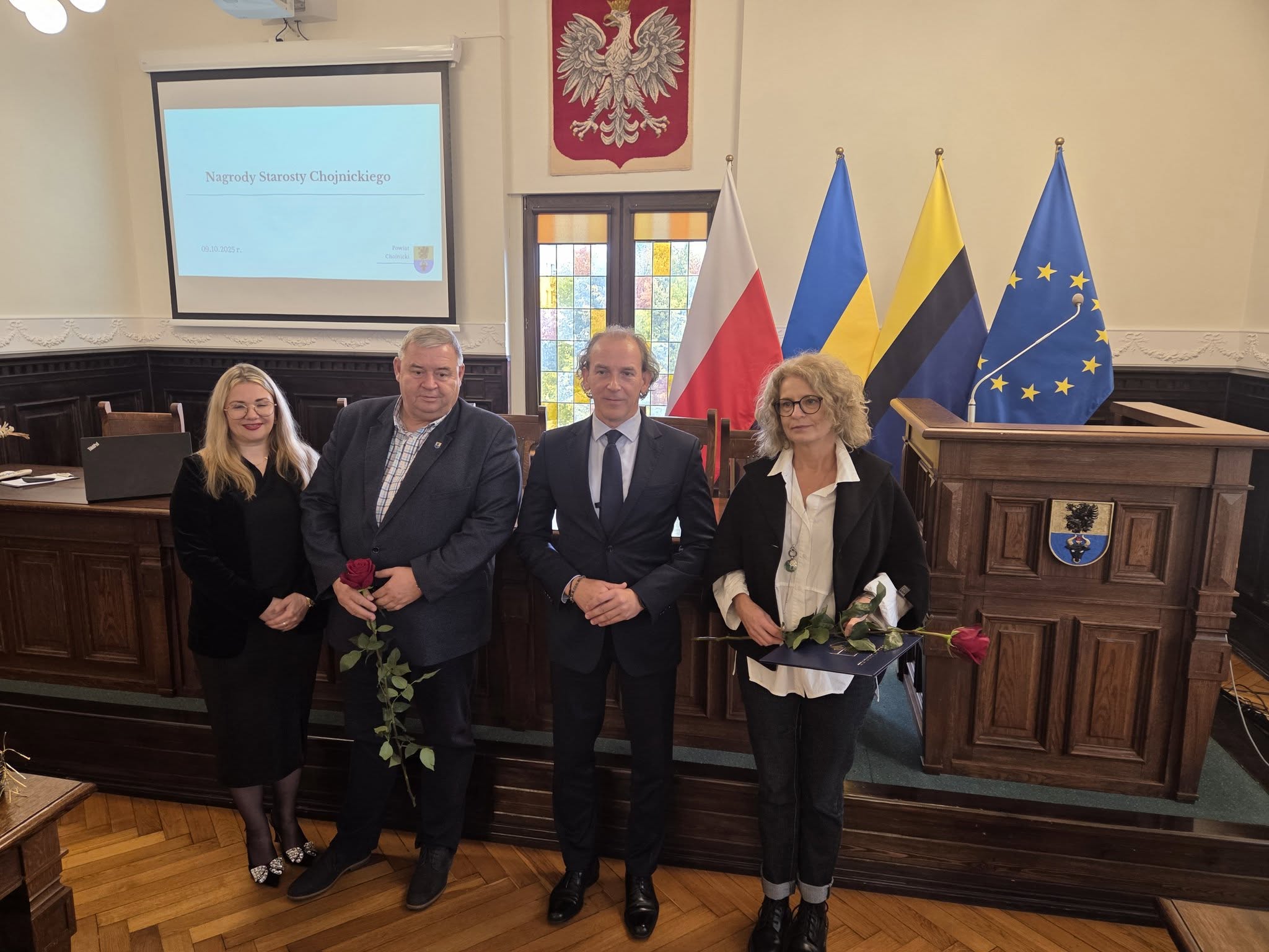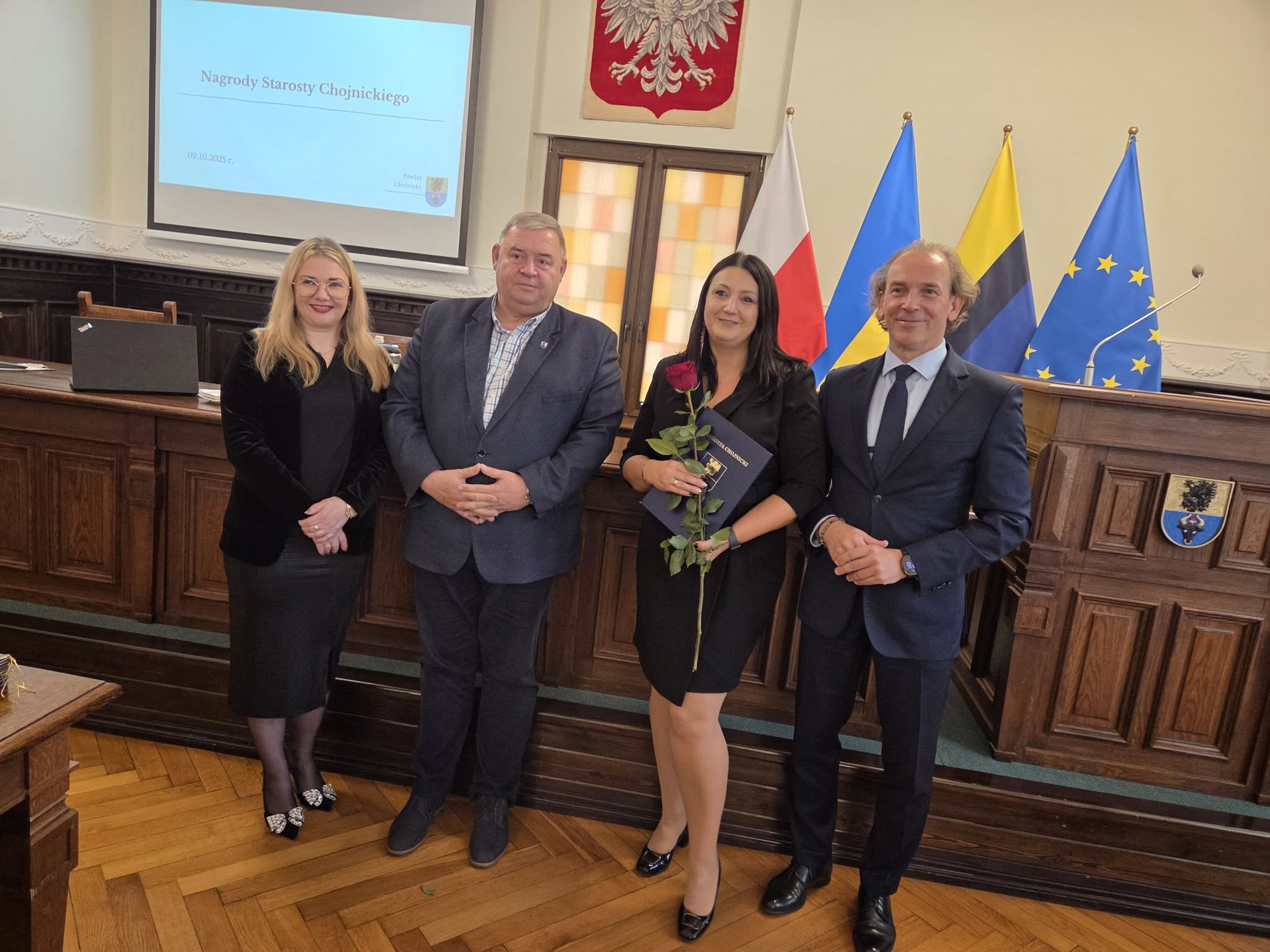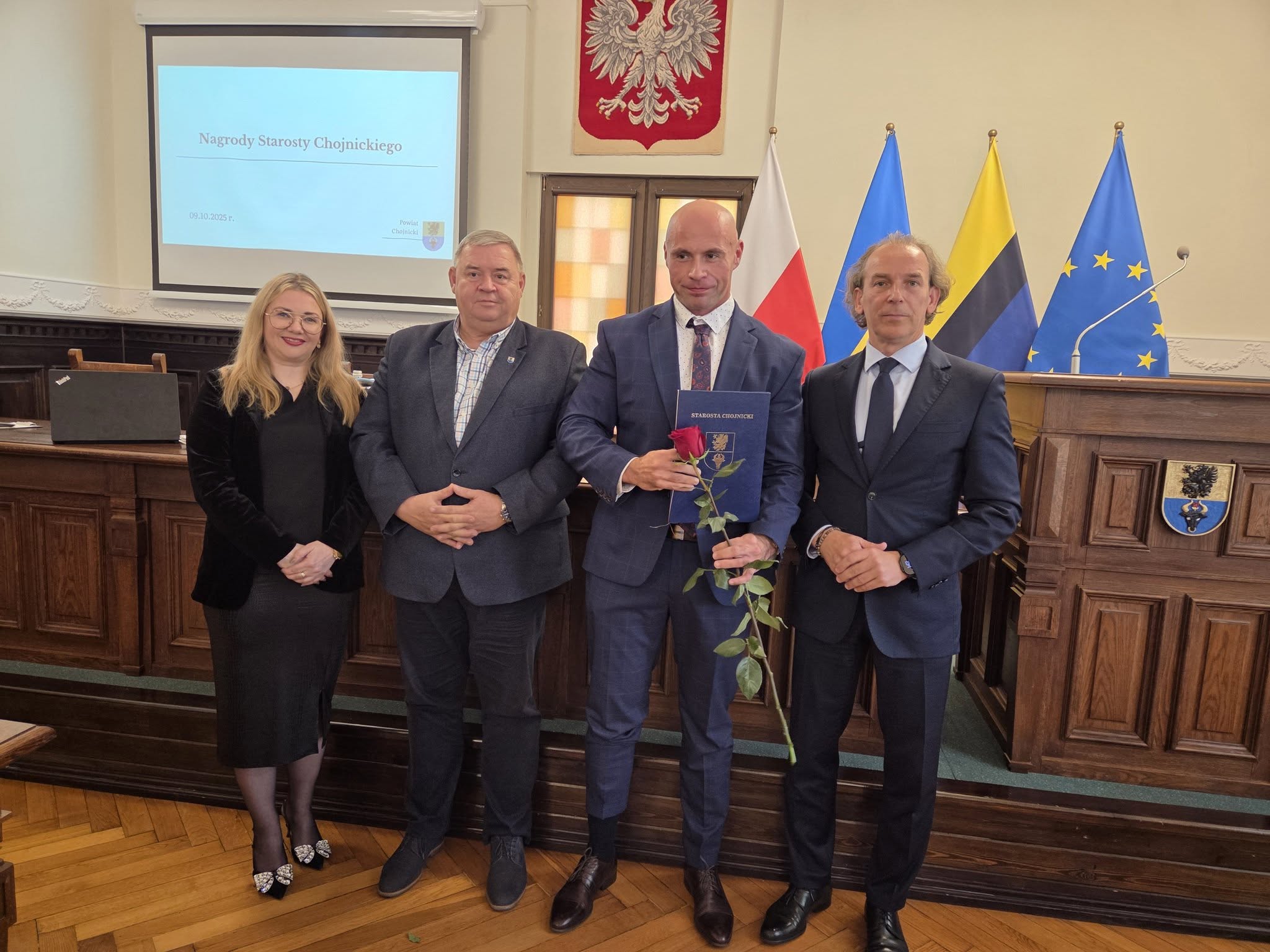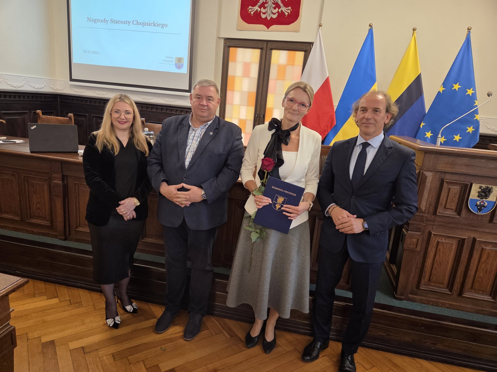 Uroczystość wręczenia nagród odbyła się w Sali Obrad Starostwa Powiatowego w Chojnicach. Spotkaniu towarzyszyła miła, uroczysta atmosfera – nie zabrakło kawy, ciasta i odrobiny „ostrej muzyki” w wykonaniu uczniów z Zespołu Szkół Technicznych. 🎶☕🍰