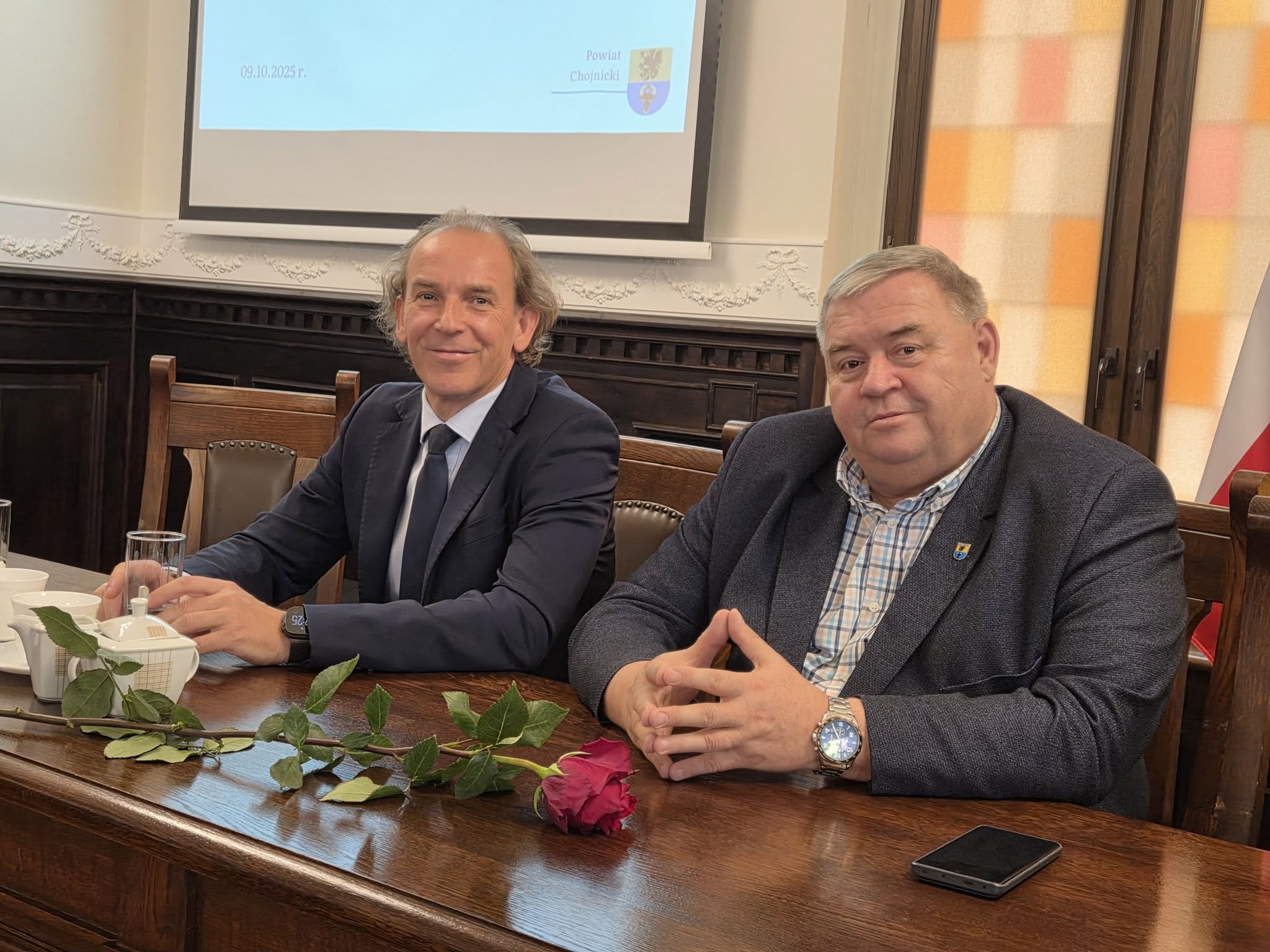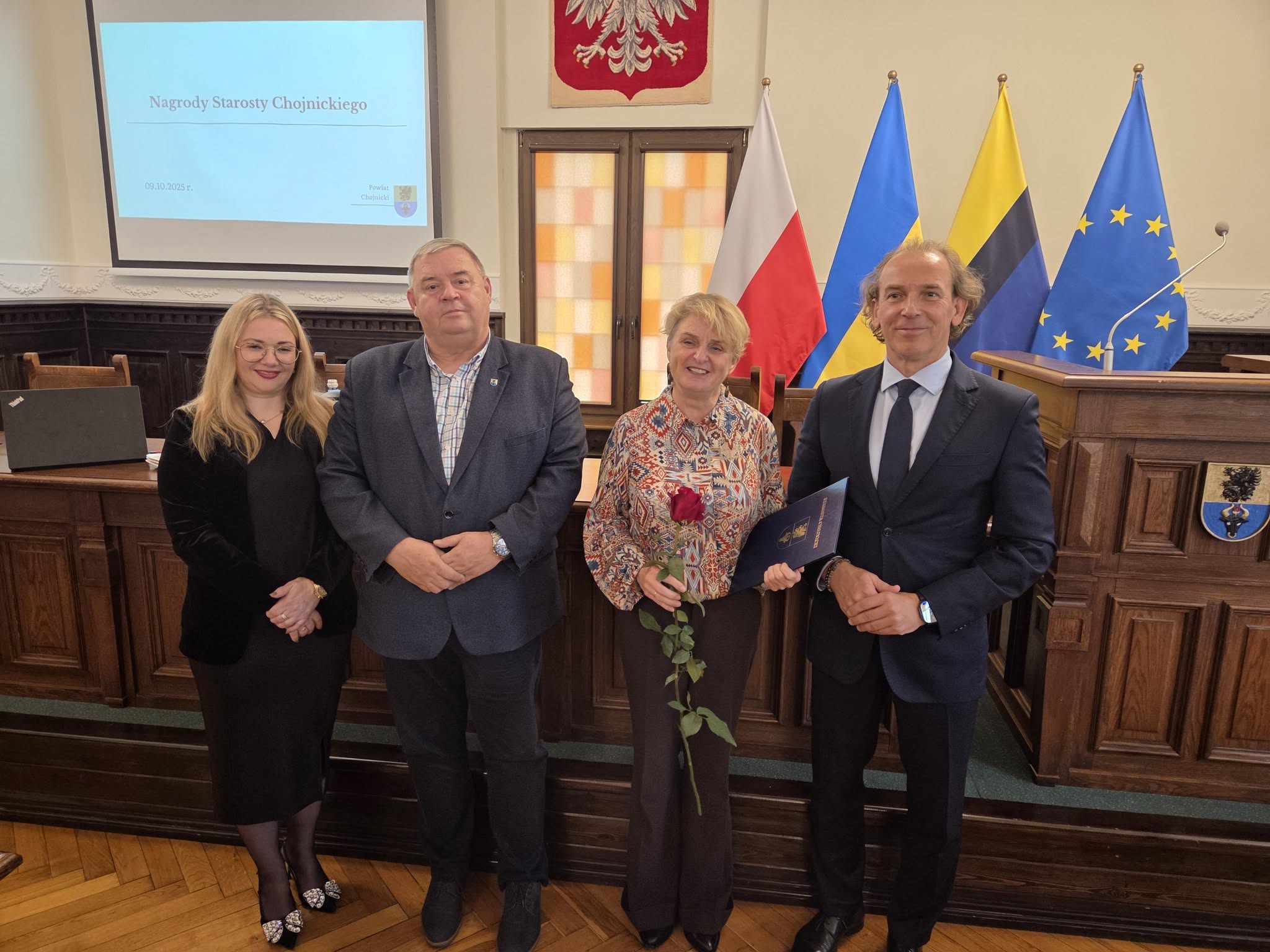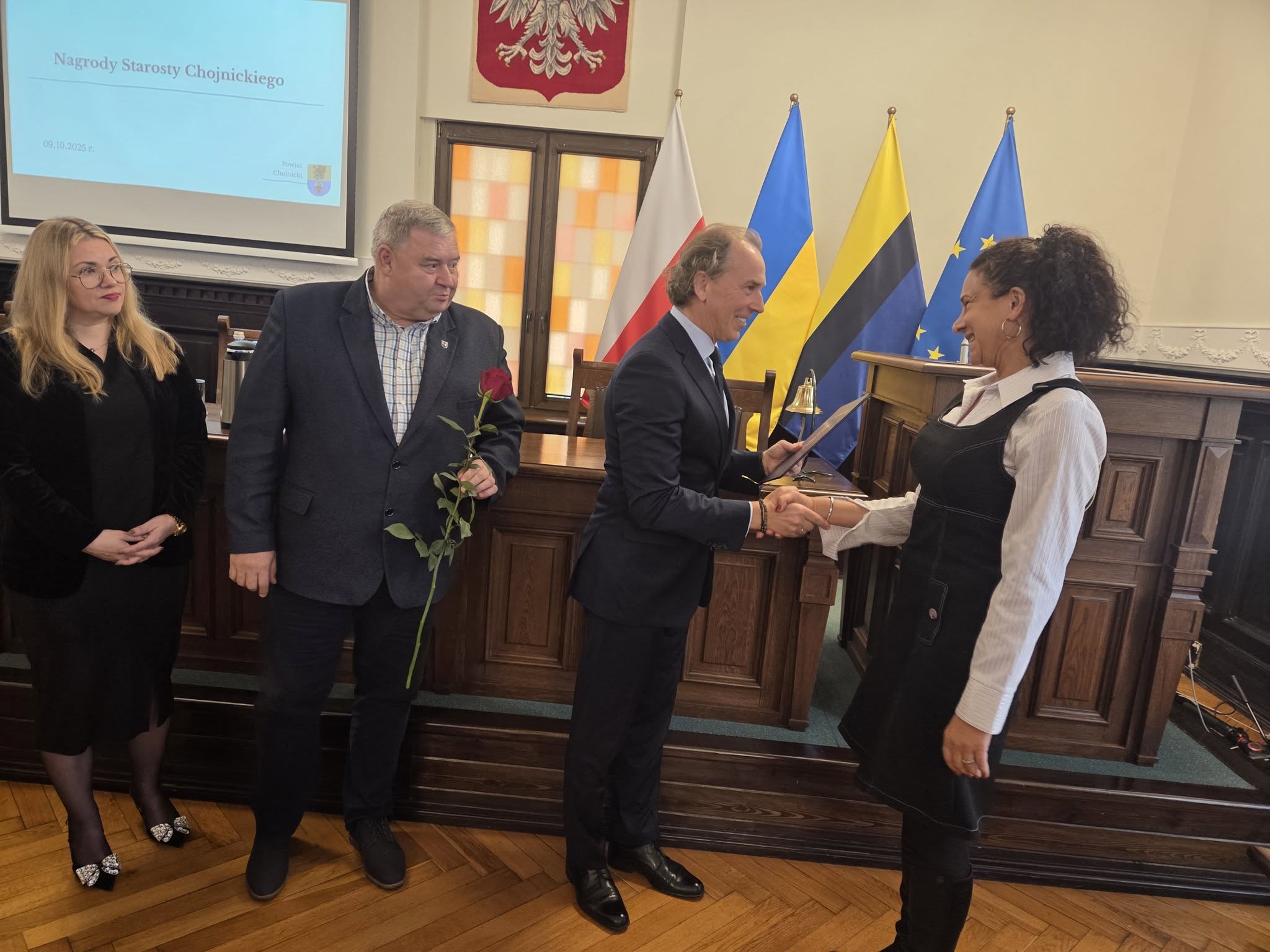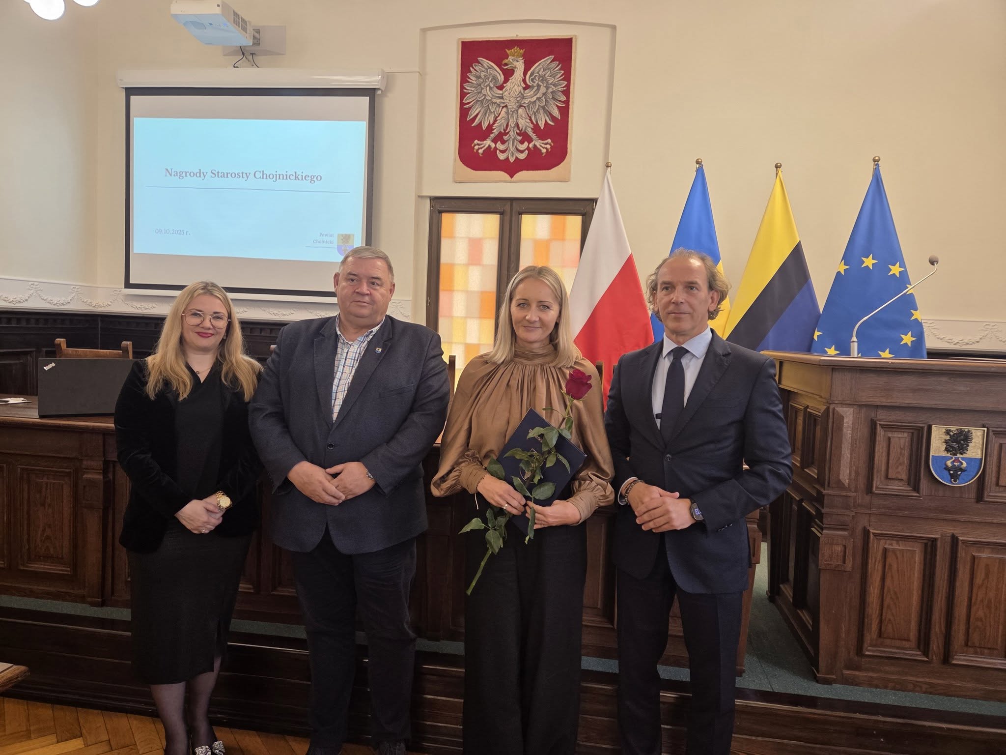 Uroczystość wręczenia nagród odbyła się w Sali Obrad Starostwa Powiatowego w Chojnicach. Spotkaniu towarzyszyła miła, uroczysta atmosfera – nie zabrakło kawy, ciasta i odrobiny „ostrej muzyki” w wykonaniu uczniów z Zespołu Szkół Technicznych. 🎶☕🍰