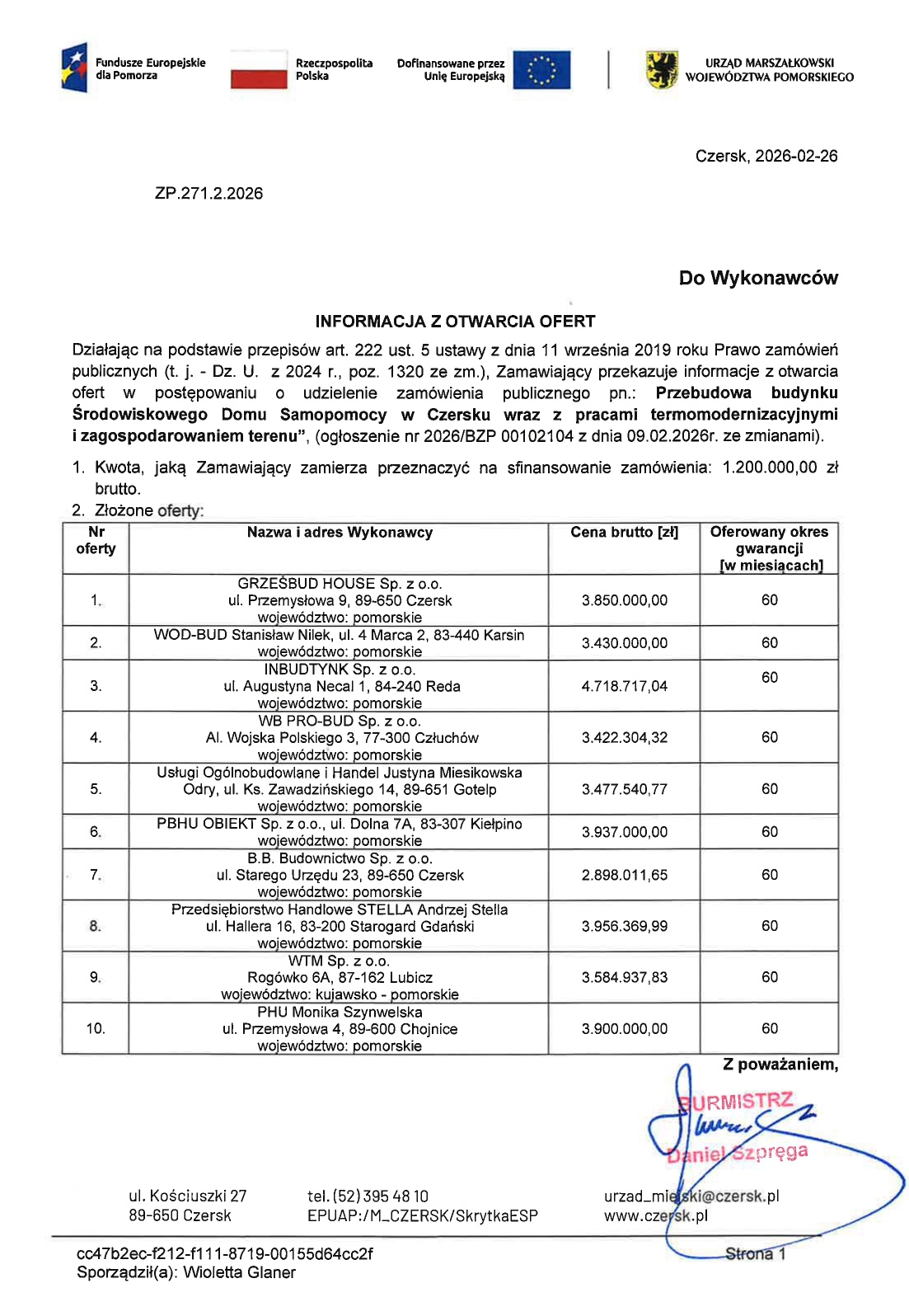 Rozpiętość ofert jest spora – od niespełna 2, 9 mln zł do 4, 7 mln zł. Wystartowały trzy firmy z gminy Czersk – szczegółowe zestawienie – poniżej. Samorząd na relaizację zadania chce przeznaczyć 1,2 mln zł. Teraz nastąpi tryb negocjacji z firmami.