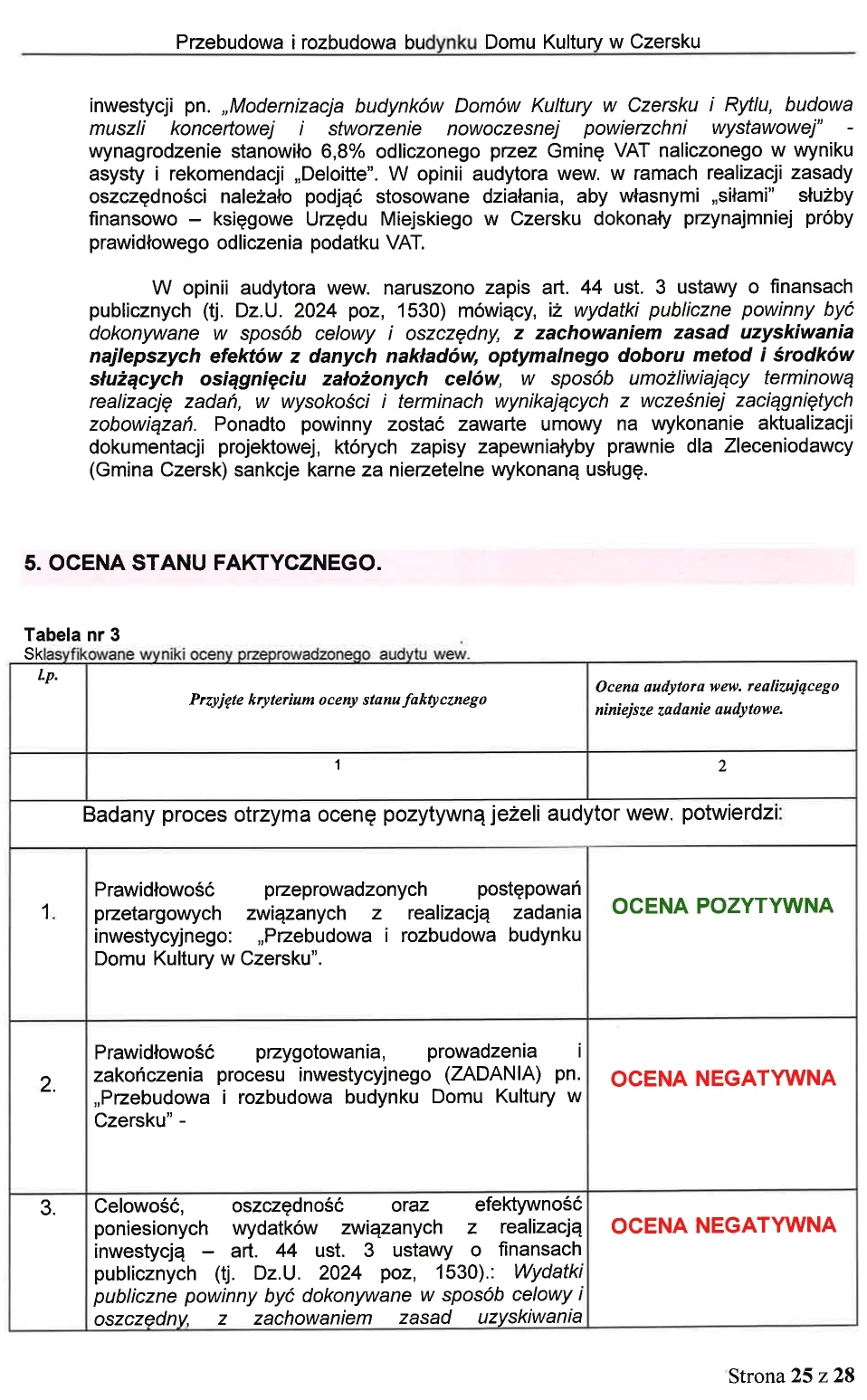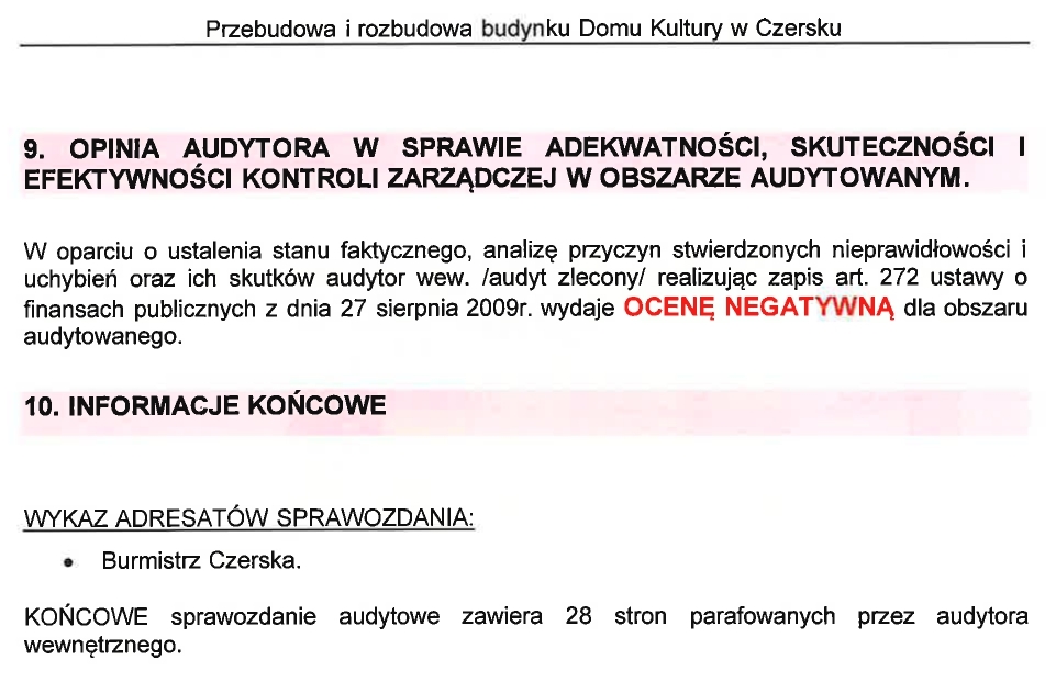 Audytor wew. stwierdza naruszenie zarówno przez projektanta jak również przez inspektora nadzoru inwestorskiego. Na podstawie ustaleń audytowych audytor wew. stwierdza, iż po stronie Inwestora ( Gminy Czersk) również wystąpiły nieprawidłowości w procesie przygotowania i prowadzenia procesu inwestycyjnego realizacji zadania o nazwie " Przebudowa i rozbudowa budynku Dom Kultury w Czersku". W opinii audytora wew. stwierdzone nieprawidłowości dotyczą: