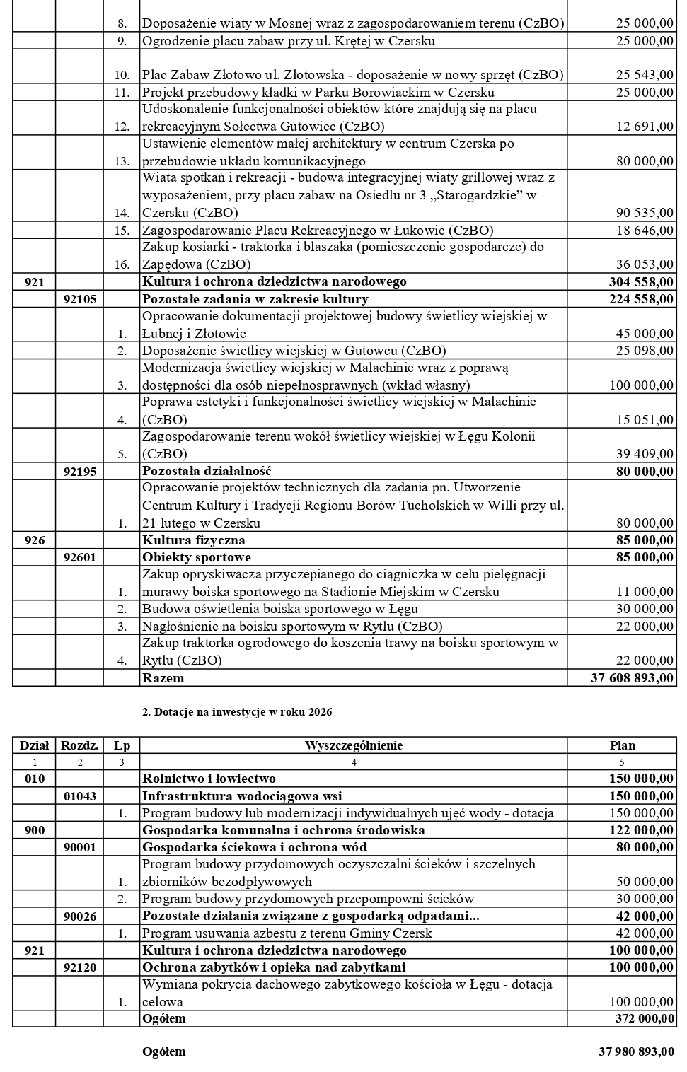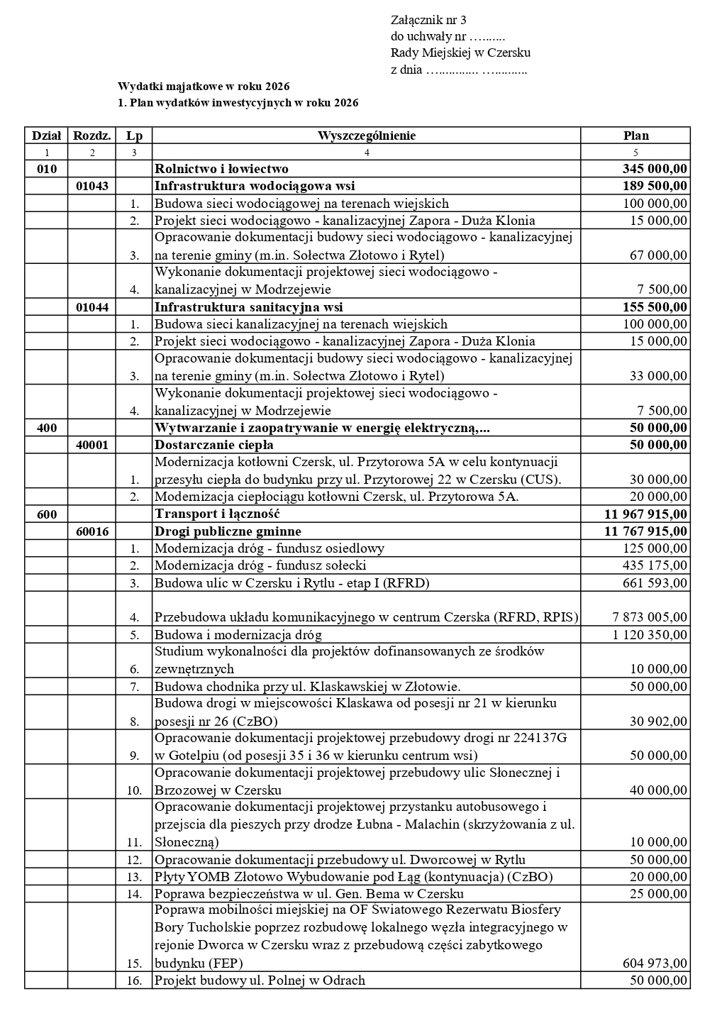 Poniżej wykaz planowanych wydatków majątkowych na 2026 rok: