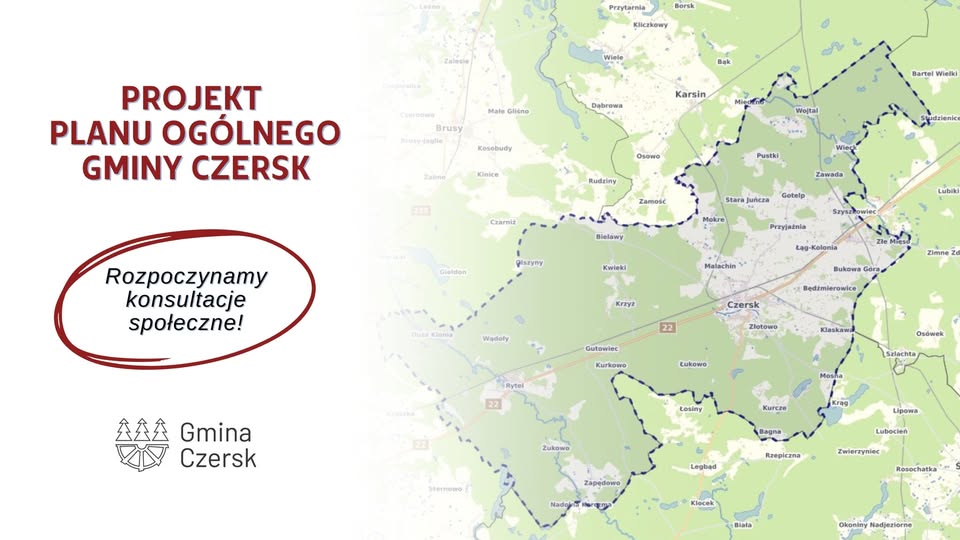Burmistrz Czerska zawiadamia o rozpoczęciu konsultacji społecznych do projektu planu ogólnego gminy Czersk wraz z prognozą oddziaływania na środowisko. Konsultacje społeczne potrwają od 10 kwietnia 2026 r. do 11 maja 2026 r.