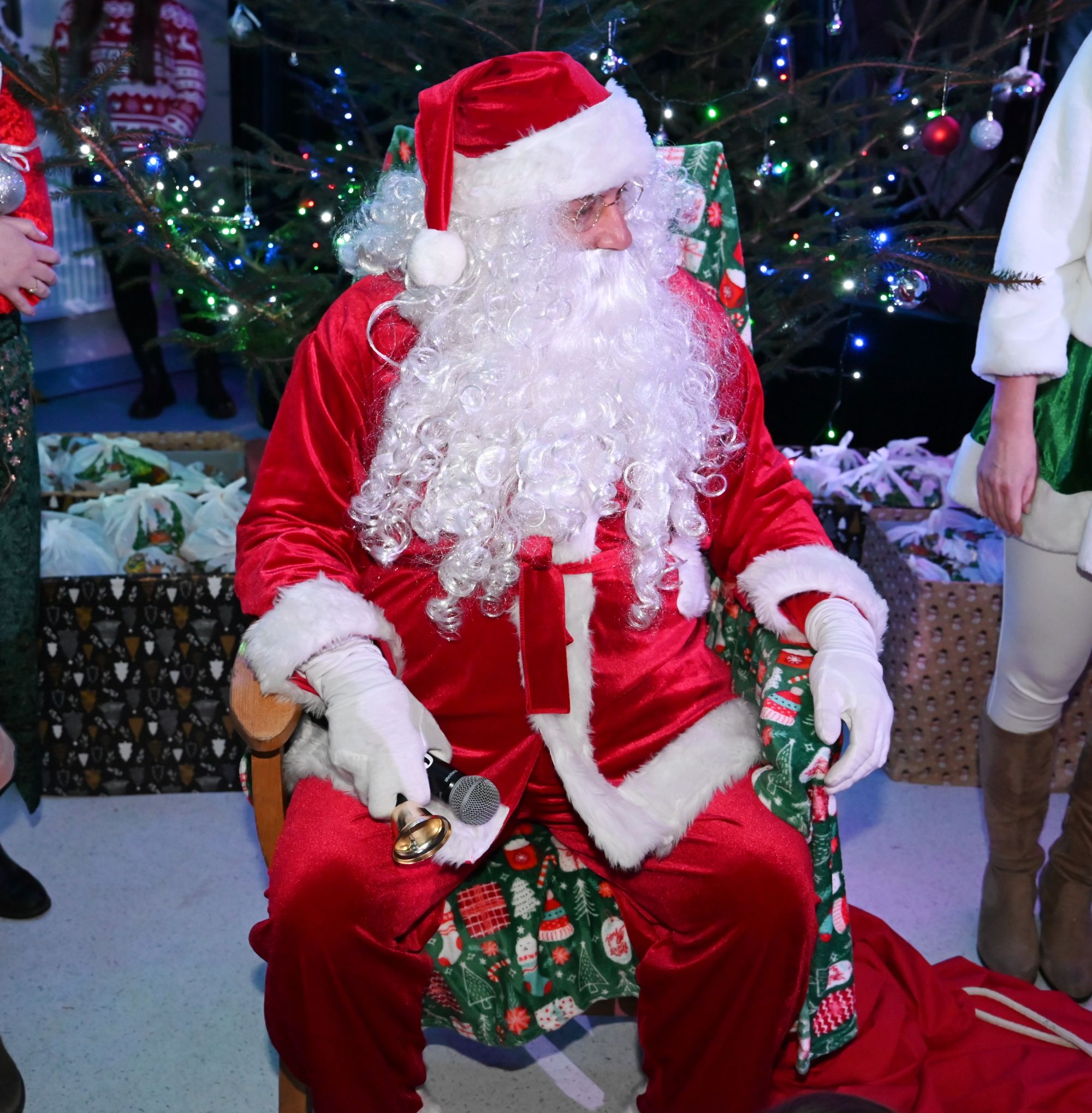 Mikołaj wraz z pomocnikami - elfami i śnieżynką rozdawał przygotowane upominki od Sołtysa i Rady Sołeckiej Łęga.