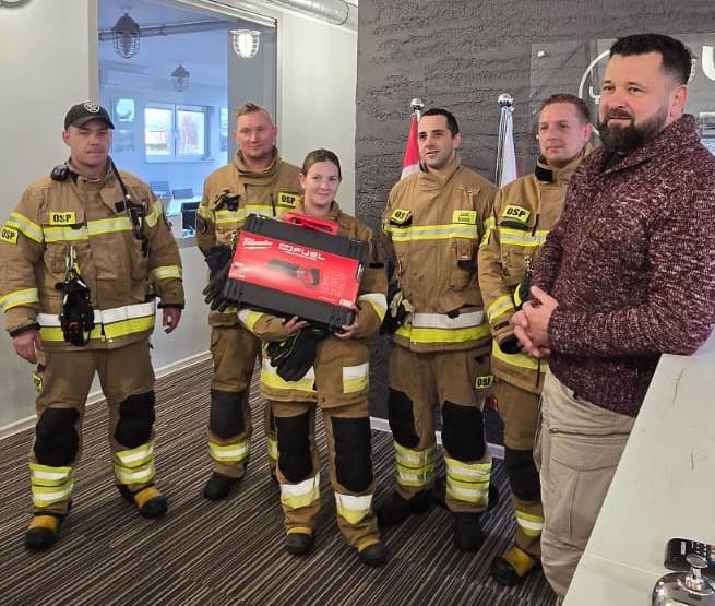 Prezes YONGLI Polska Tomasz Mundry po ćwiczeniach strażackich na terenie zakładu wręczył druhom z OSP w Łęgu akumulatorową piłę szablastą.