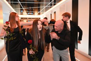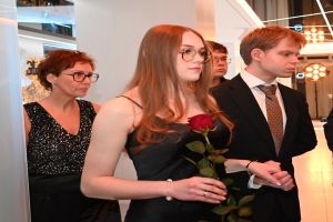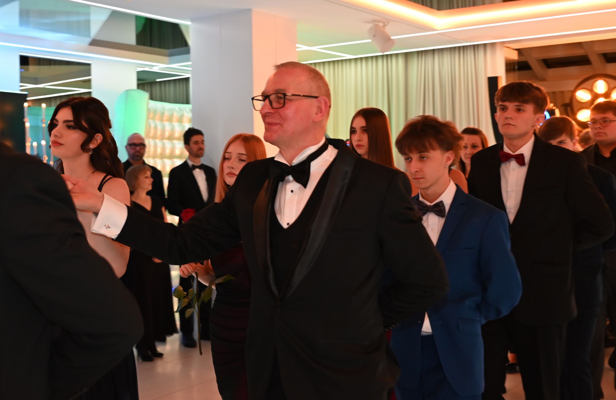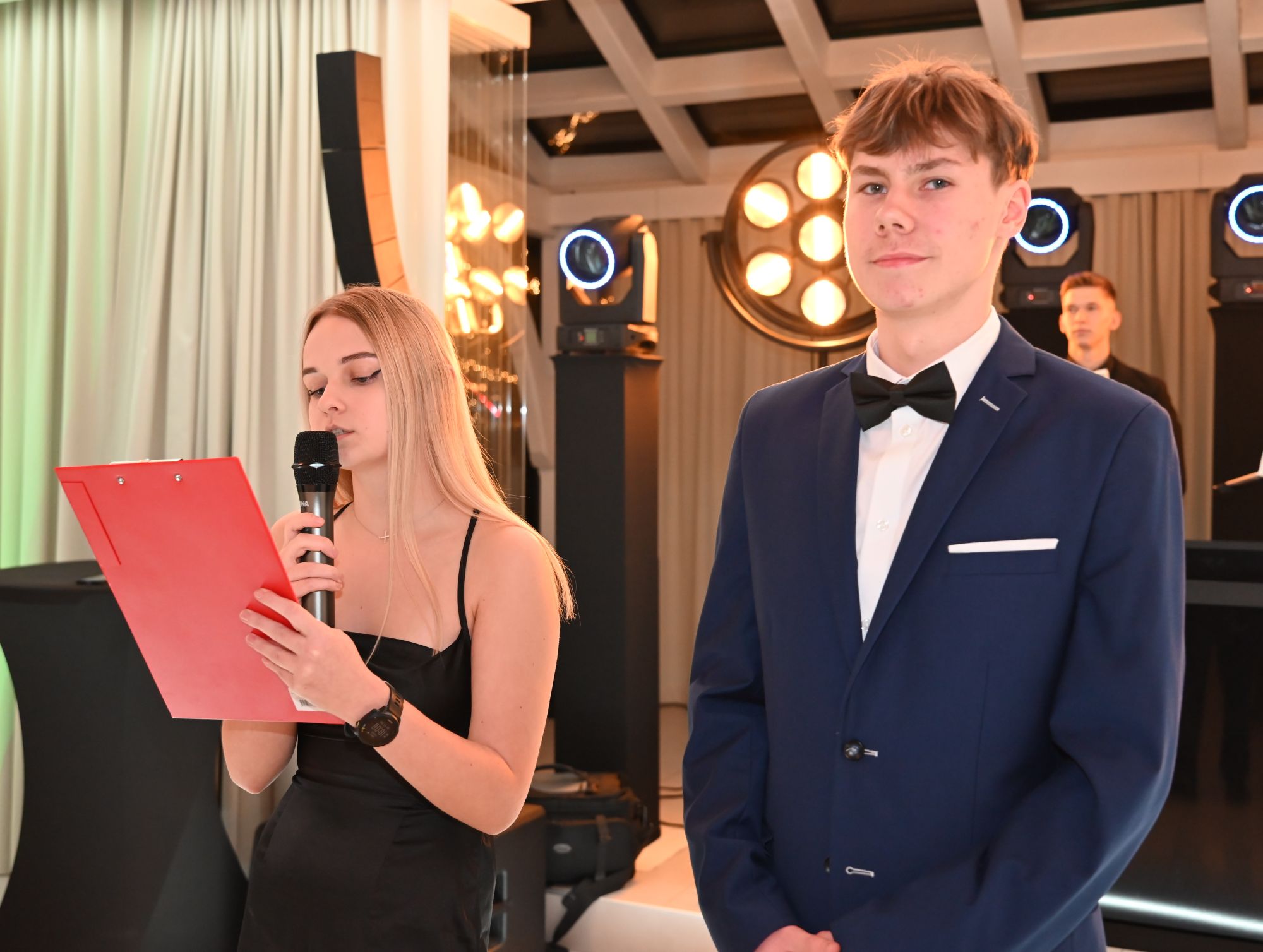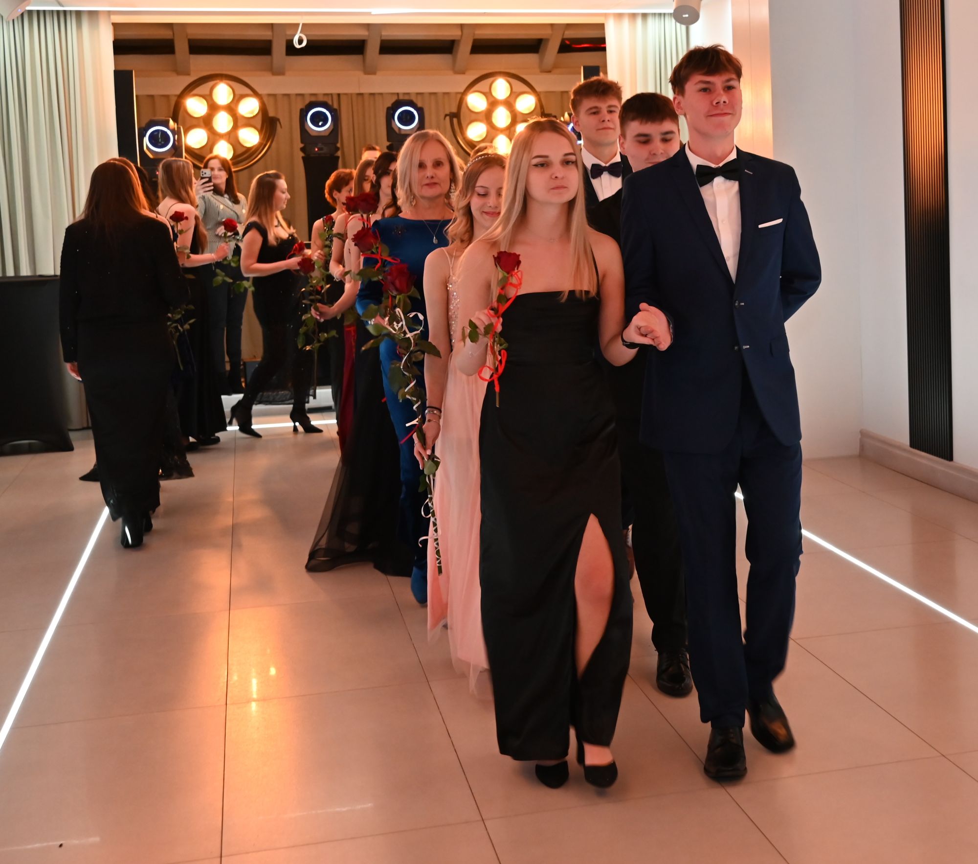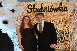 Paulina Wajdzik i Damian Urbański w imieniu całej klasy uroczyście powitali wszystkich uczestników Studniówki. Życzenia udanej zabawy, połączone z krótką retrospekcją z życia klasy piątej Technikum i jej wychowawczyni p. Iwony Chmielewskiej, złożyła dyrektor szkoły Elwira Bieszke-Binnebesel.