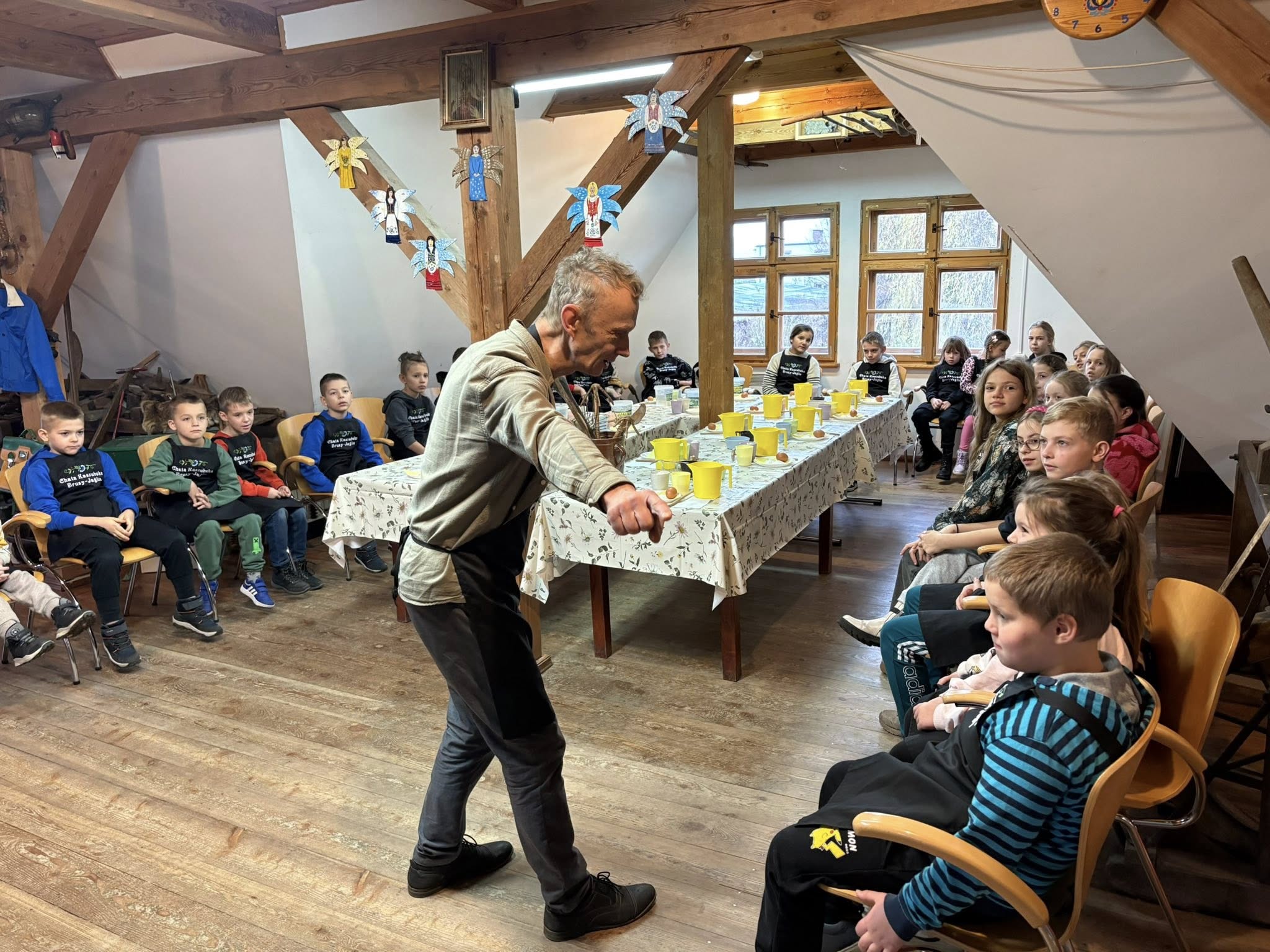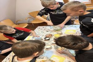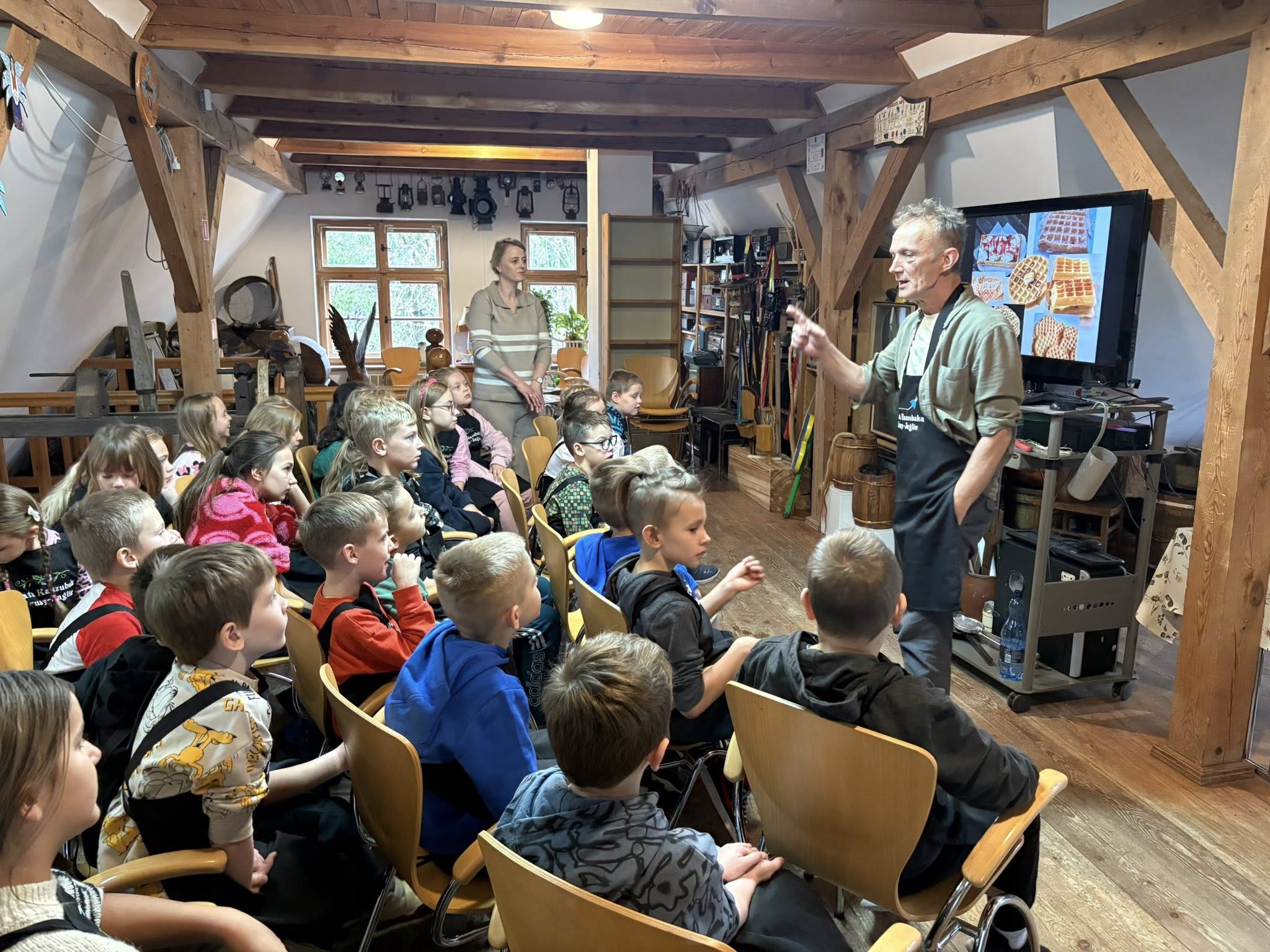 We wtorek (18.11) uczniowie klas 1, 2 i 5 SP w Gotelpiu wybrali się na wycieczkę do skansenu „Chata Kaszubska” w Brusach-Jagliach. W ramach zajęć z języka kaszubskiego odbyły się tam warsztaty ognistych wafli. Dzieci samodzielnie przygotowywały wafle, poznały ich historię oraz aktywnie odpowiadały na pytania prowadzących.
