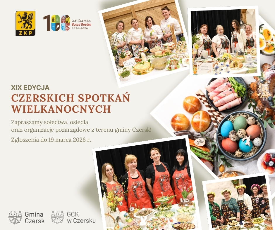 30 marca 2026 r. (poniedziałek) w Gminnym Centrum Kultury w Czersku odbędzie się XIX edycja Czerskich Spotkań Wielkanocnych. W tym roku motywem przewodnim konkursowych stołów będą „Wielkanocne potrawy z jaj i świąteczne pisanki”.