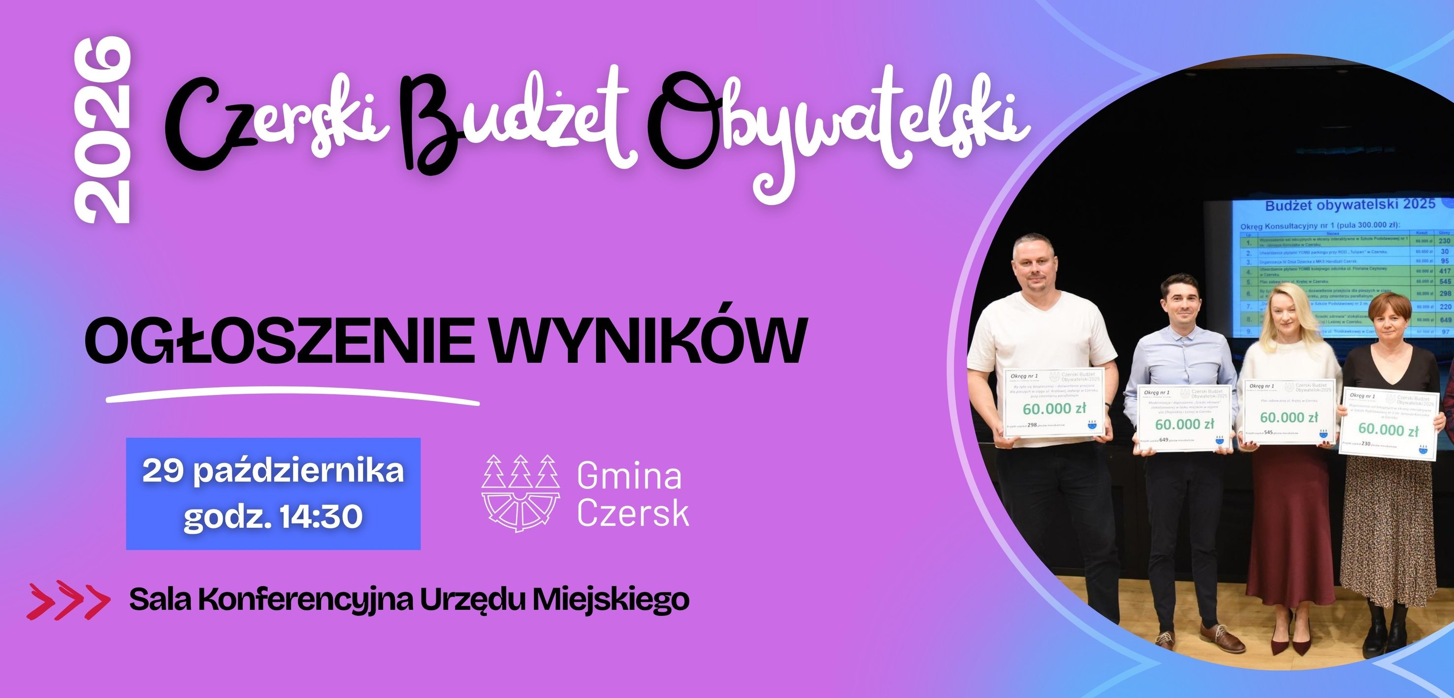 Już 29 października 2025 r. o godz. 14:30 w Sali Konferencyjnej Urzędu Miejskiego w Czersku (nad punktem Wydziału Komunikacji) odbędzie się ogłoszenie wyników głosowania mieszkańców w ramach Czerskiego Budżetu Obywatelskiego 2026.