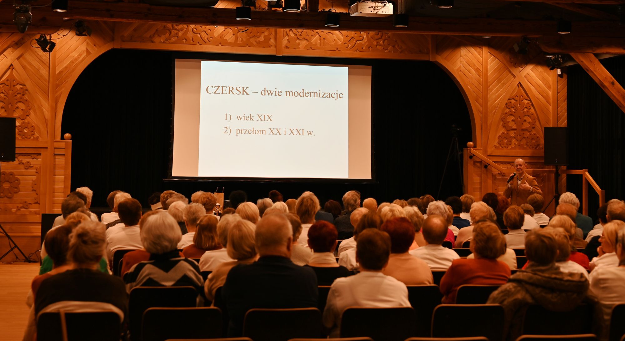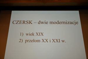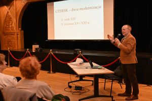 Wykład poprowadził Hieronim Kucharski, lokalny historyk i mieszkaniec Czerska, który przybliżył temat „Dwie modernizacje Czerska” - pierwsza w drugiej połowie XIX w., druga przełom XX i XXI w. Prelekcja przedstawiona w przystępny sposób, jak zawsze z odrobiną żartu, pokazała, rozwój miasta w minionym czasie. Historyk mówił również o tym, jak zmieniał się sposób życia Czerszczan.
