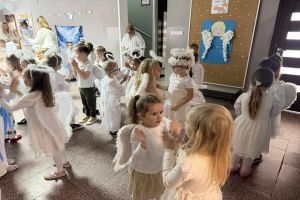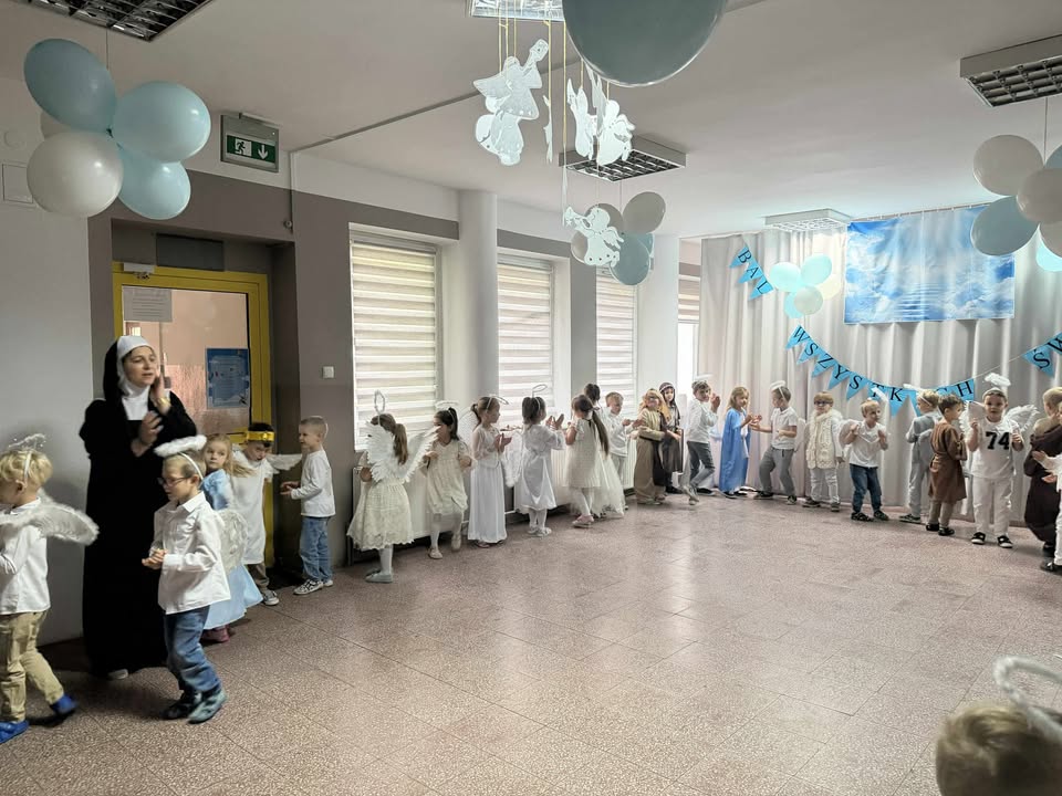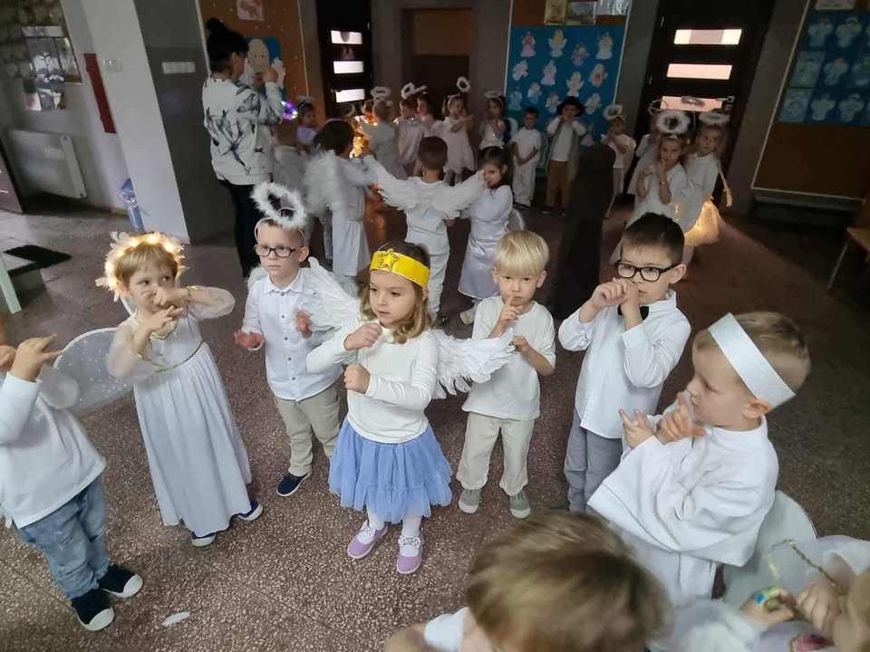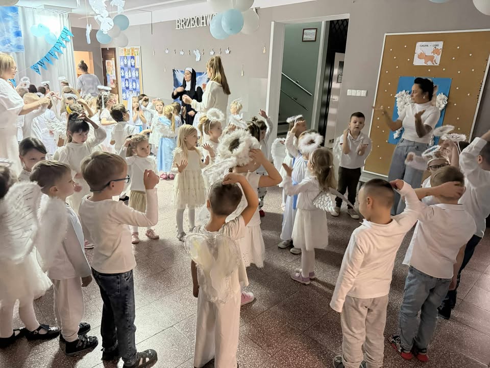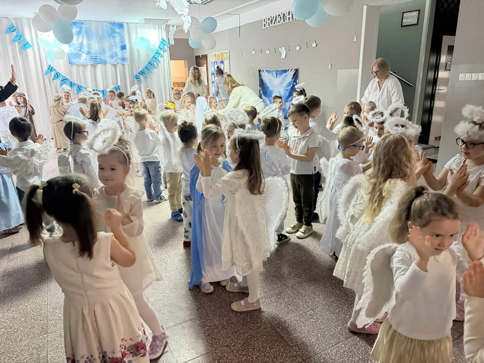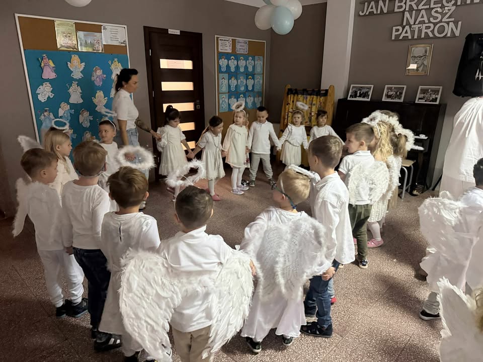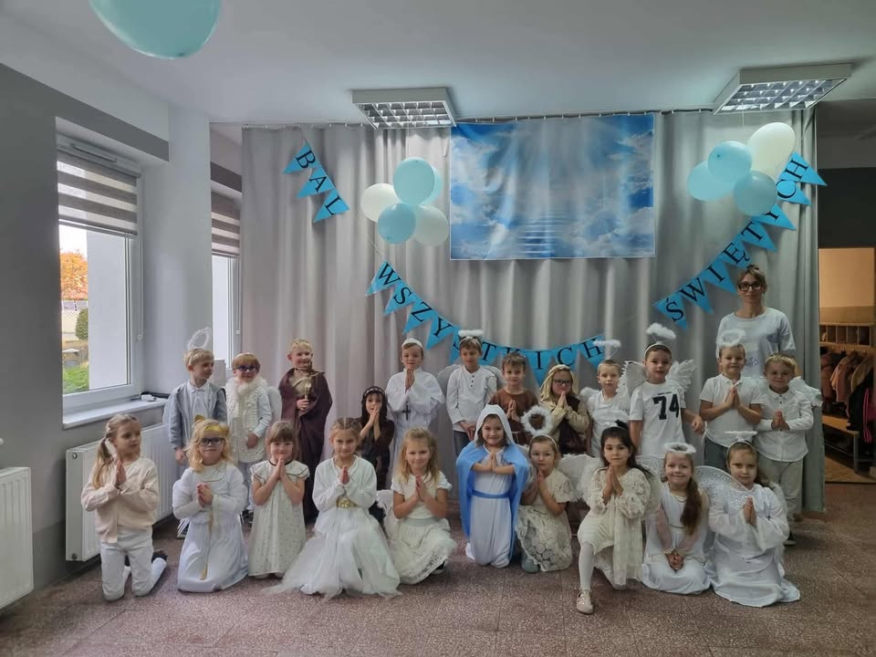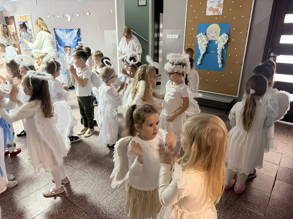 Wśród licznych Aniołków pojawiły się postacie różnych Świętych – dziękujemy Rodzicom za przygotowanie tak pięknych strojów! Nasze przedszkole zamieniło się w miejsce wspólnej zabawy, śpiewu, tańców i integracji. Atmosfera radości i wzajemnej życzliwości towarzyszyła wszystkim przedszkolakom od początku do końca. 🌈