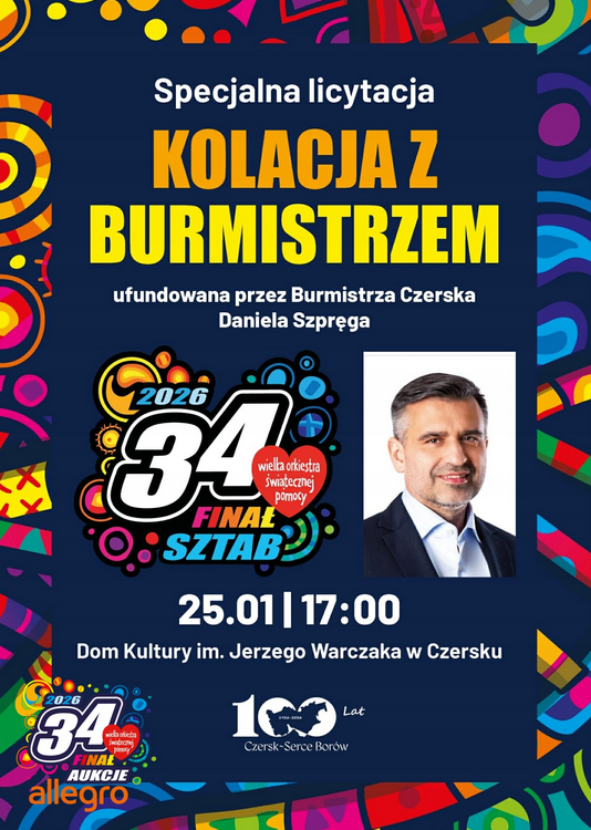 Zapraszamy do udziału w specjalnej licytacji, której przedmiotem jest kolacja z Burmistrzem Czerska – Danielem Szpręgą. To niepowtarzalna okazja do spokojnej rozmowy, wymiany myśli i spotkania z osobą, która od lat z dużym zaangażowaniem działa na rzecz mieszkańców i lokalnej społeczności.