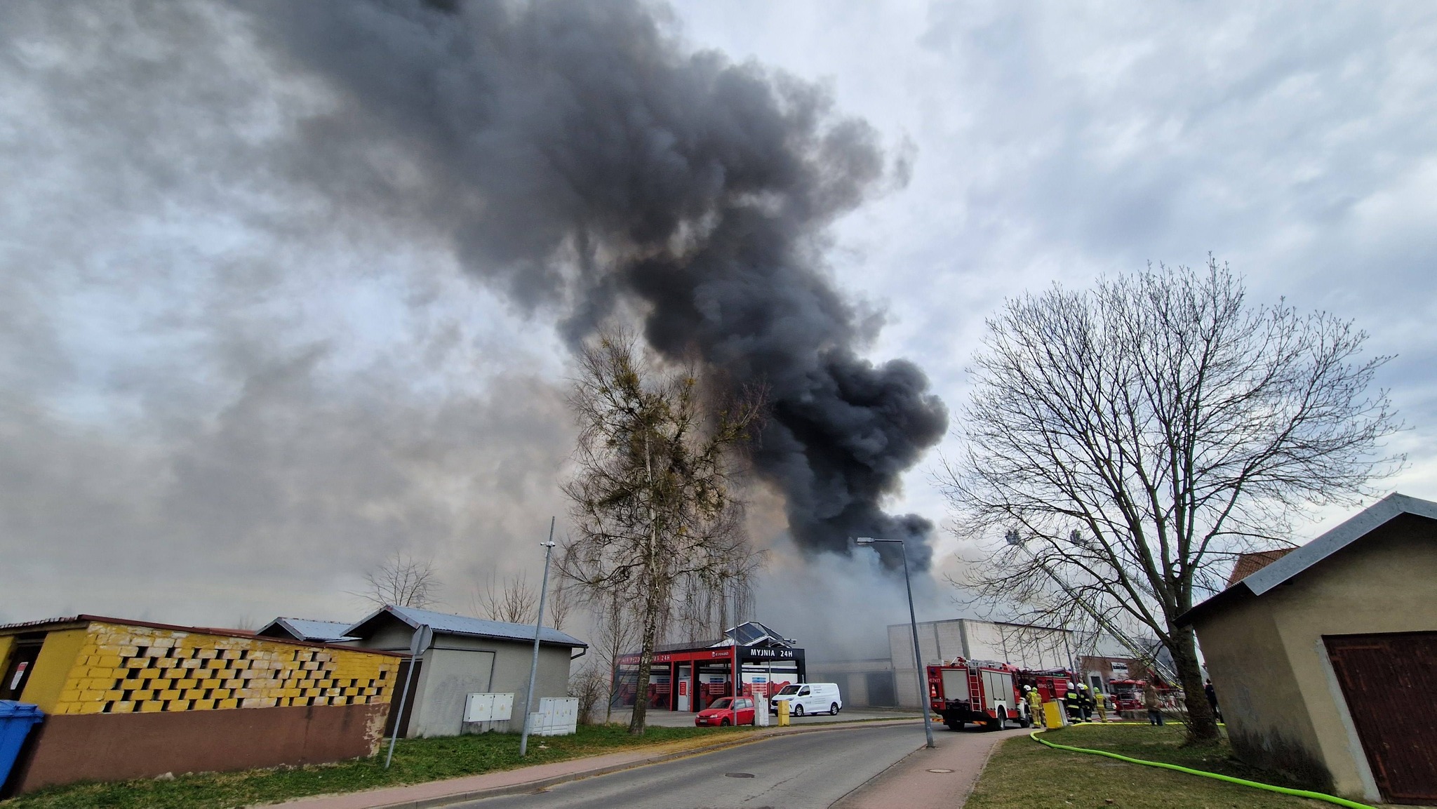 Na miejscu pracują liczne służby ratunkowe, które prowadzą intensywną akcję gaśniczą. Nad okolicą unosi się gęste zadymienie, widoczne z dużej odległości. Na miejscu zdarzenia pracuje ponad 20 zastępów straży pożarnej, w tym specjalistyczna grupa ratownictwa chemicznego oraz samochód „gaz”. Łącznie działania prowadzi około 60 strażaków.