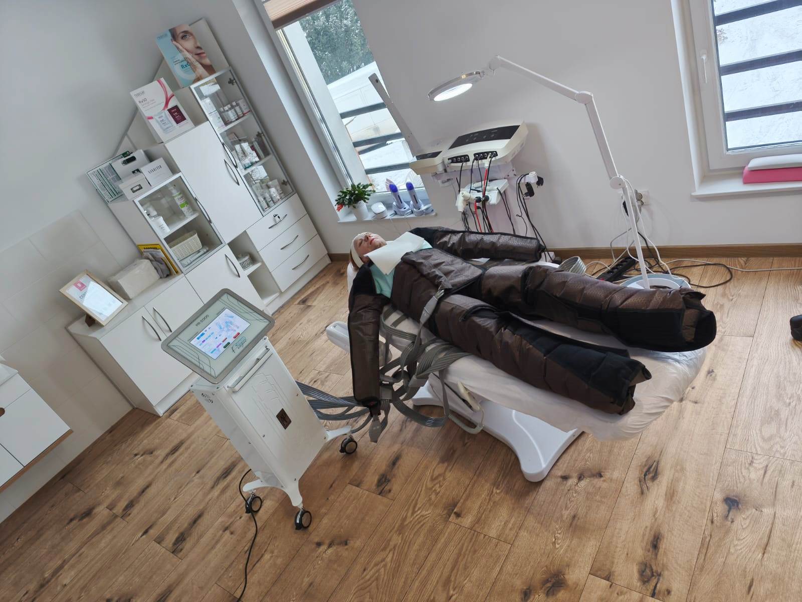 Od niedawna w gabinecie wprowadziłam zabieg presoterapii. Jest to masaż uciskowy, będący rodzajem mechanicznego drenażu limfatycznego, który stymuluje krążenie krwi i limfy przy użyciu specjalnych mankietów napełnianych powietrzem. Zabieg jest bezbolesny i pozwala uzyskać efekt już po pierwszych sesjach.