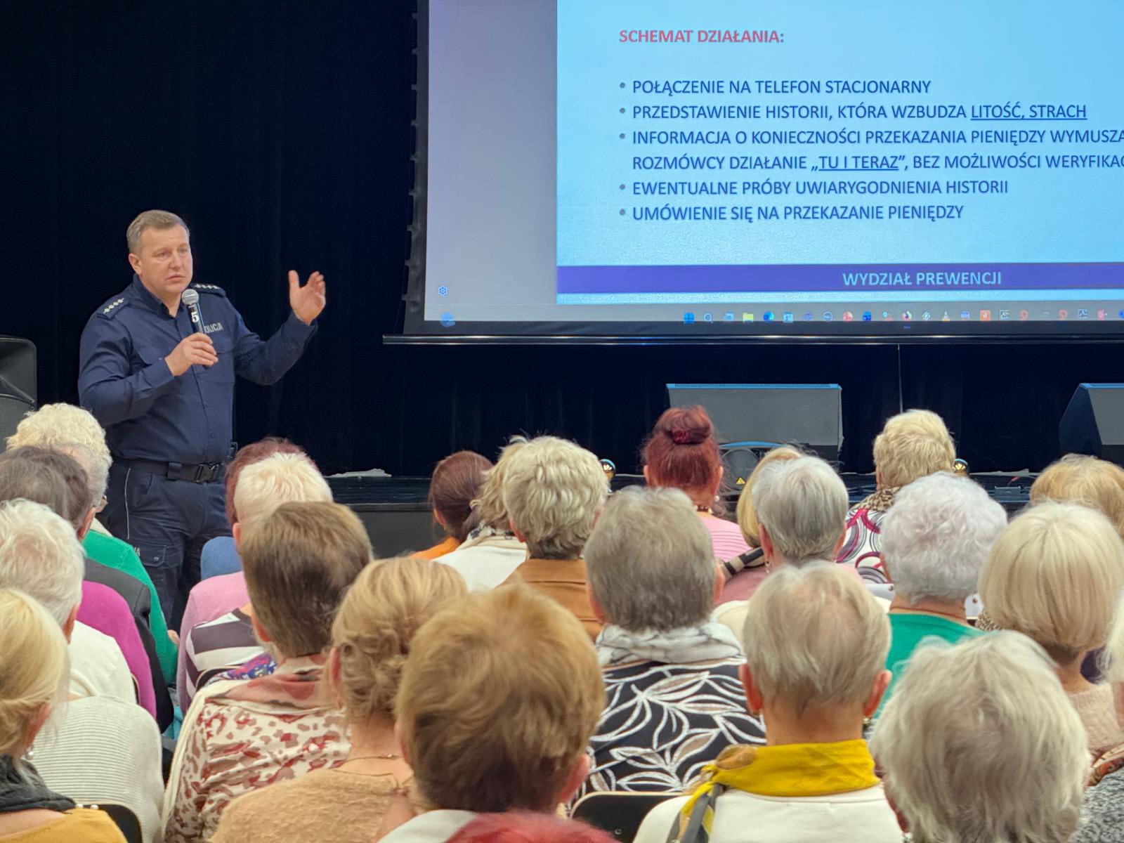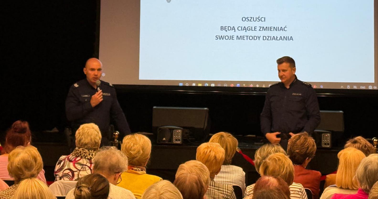 Panowie zwrócili uwagę na takie formy oszustw jak „na wnuczka”, „na policjanta”, -" a także na różne niebezpieczeństwa czyhające w internecie — od wyłudzeń, po próby kradzieży danych, o tym jak istotne jest zastrzeżenie PESELU.