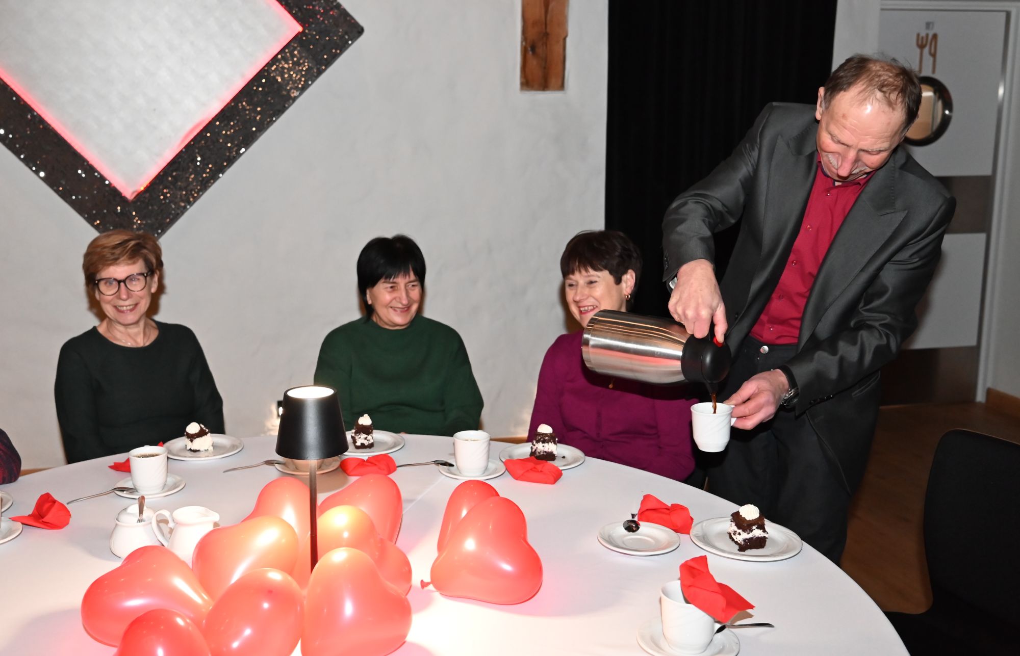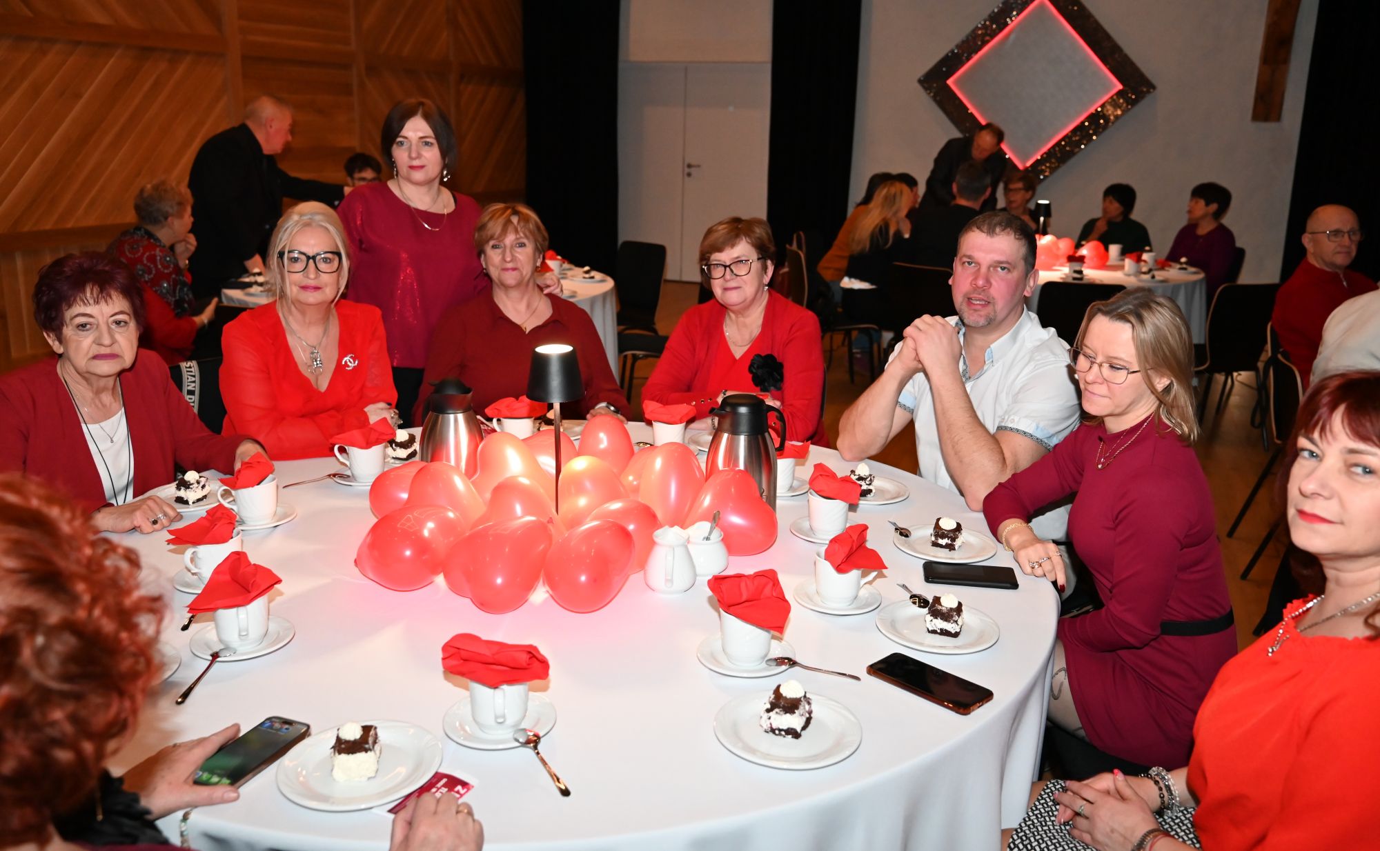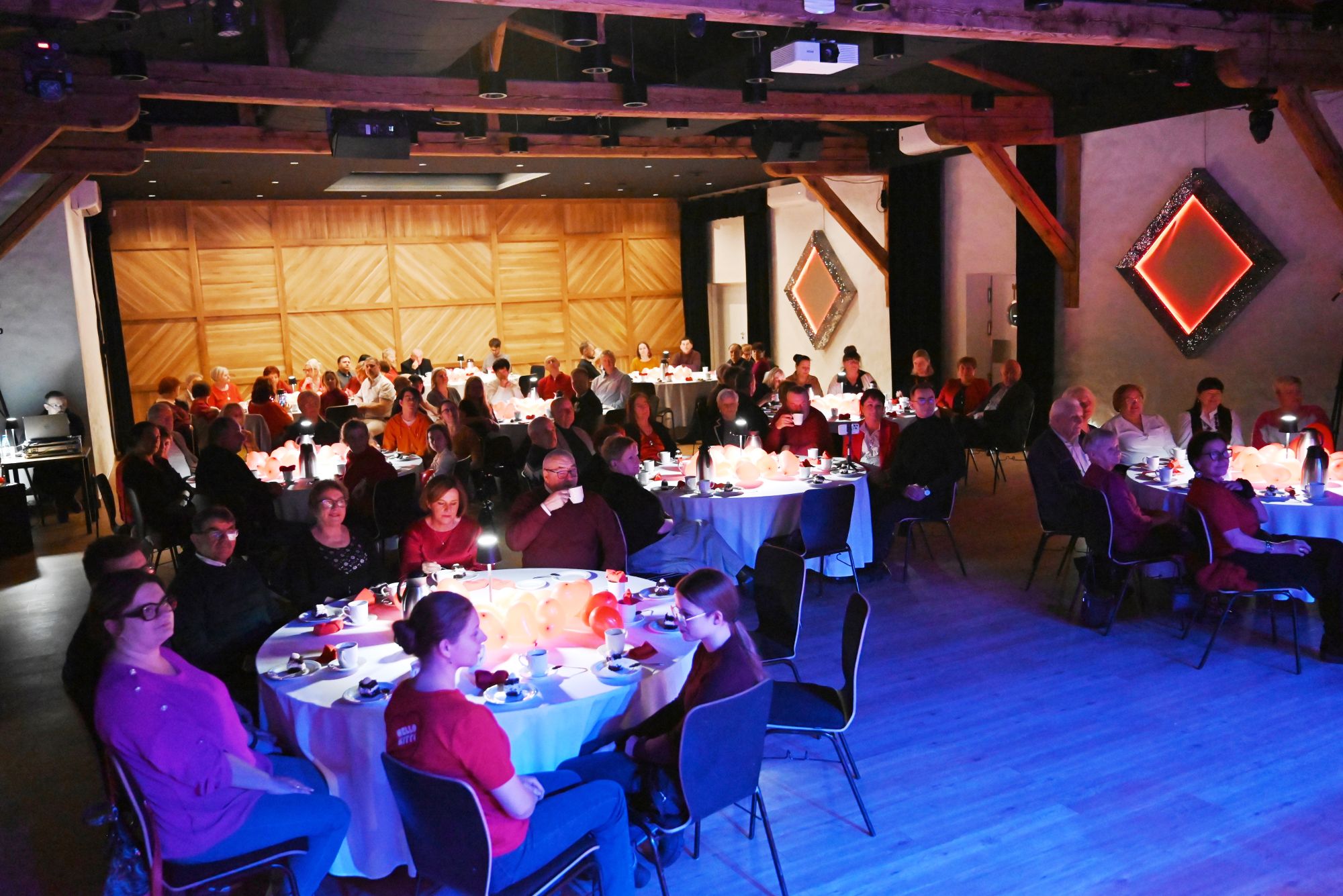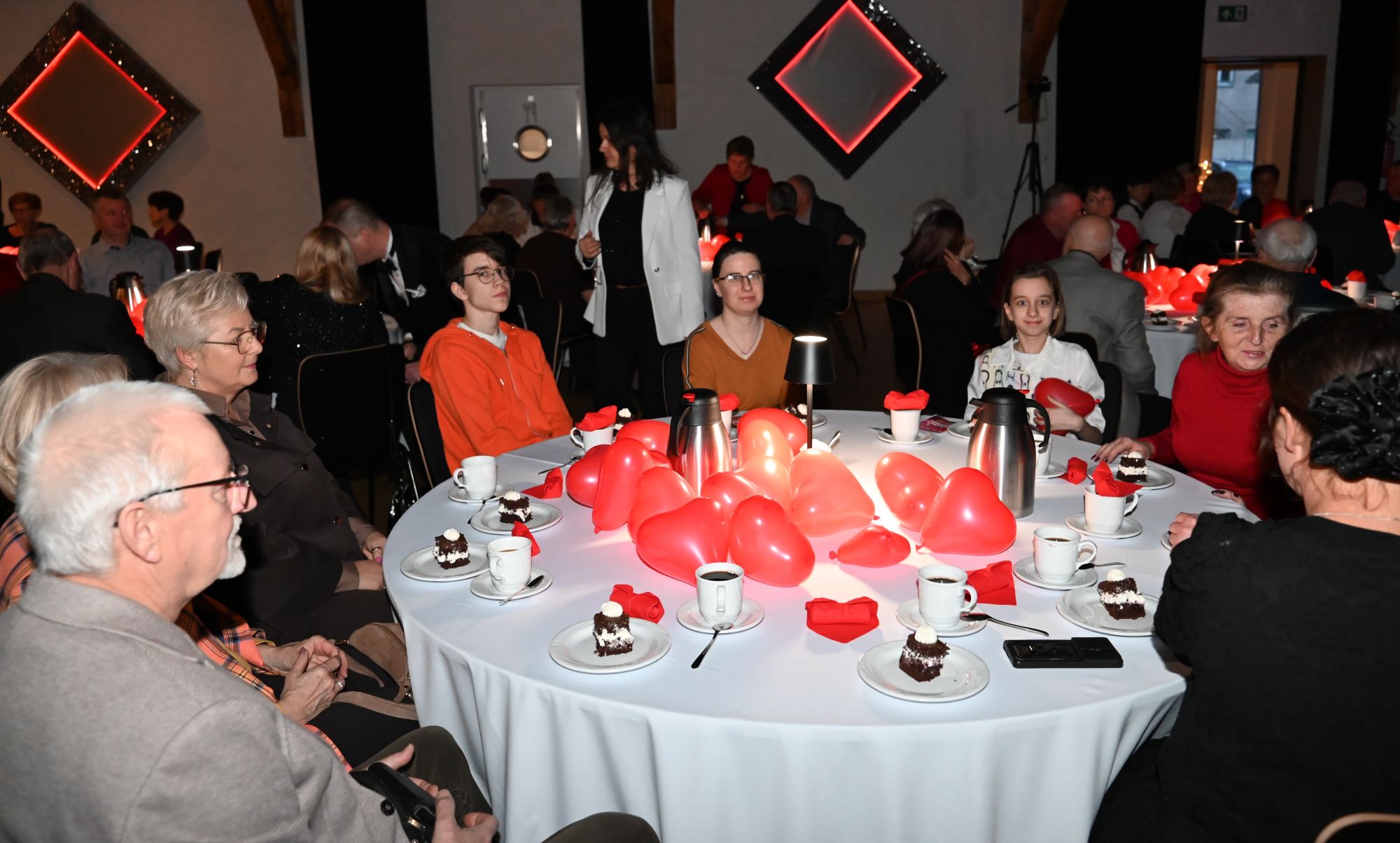 Uczestnicy wydarzenia zasiedli przy stolikach, delektując się kawą i wspólnie przeżywając muzyczne chwile w kameralnej, pełnej ciepła przestrzeni. Romantyczne brzmienia tworzyły nastrój sprzyjający rozmowom, uśmiechom i świętowaniu walentynek w spokojnej, artystycznej oprawie.