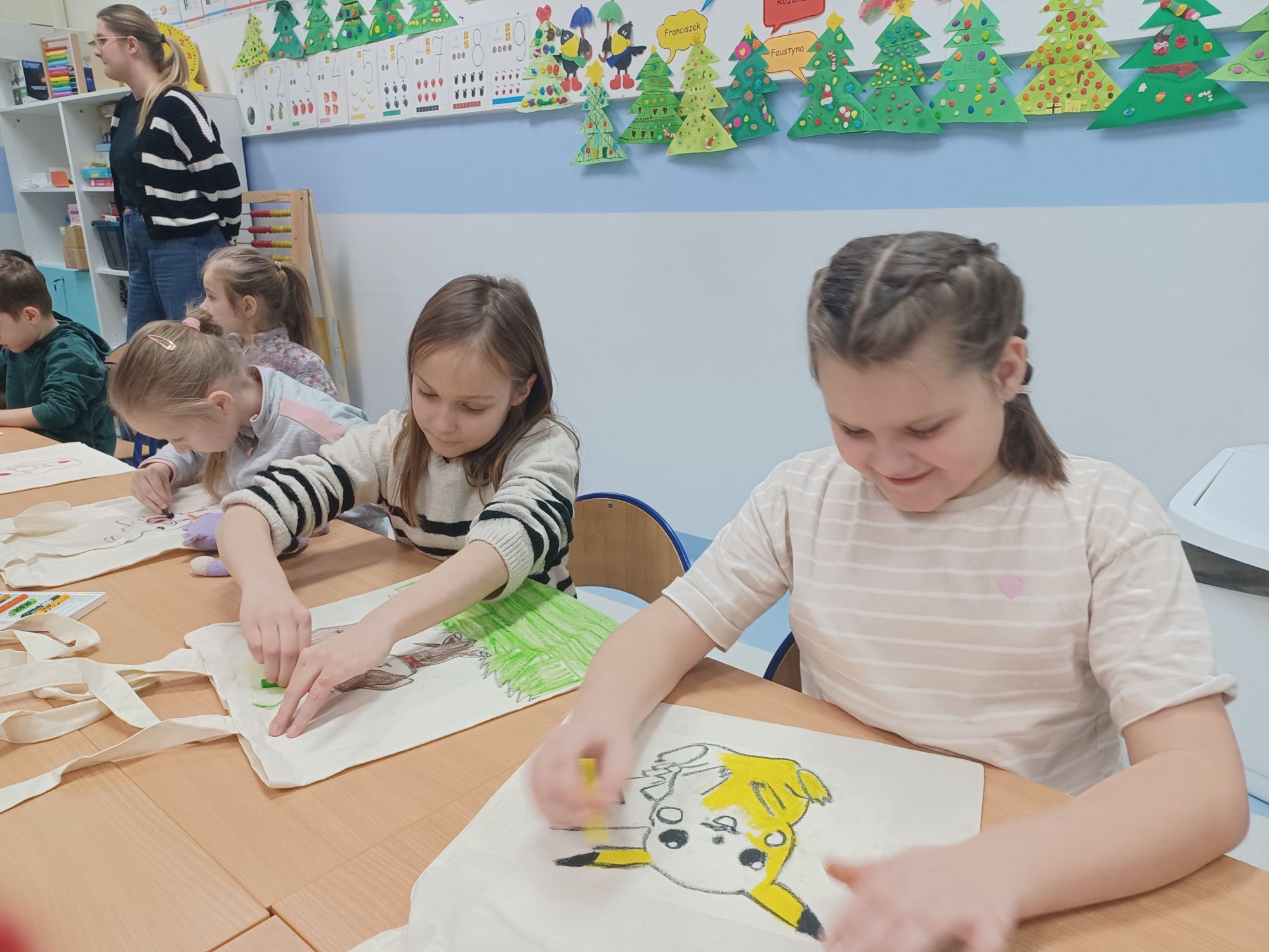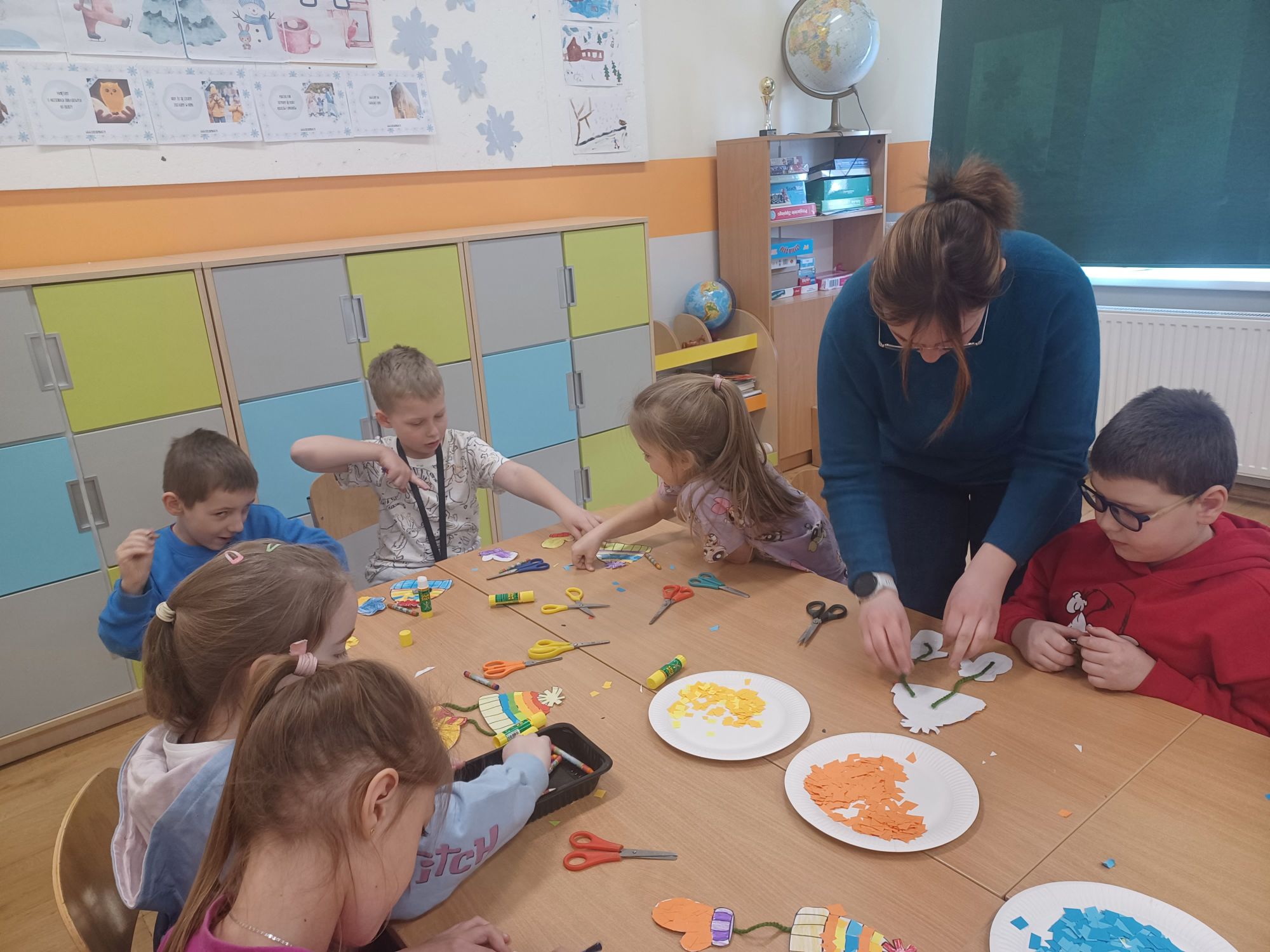 Każdy dzień zimowiska obfitował w nowe atrakcje. Poniedziałek rozpoczął się spotkaniem z panem Markiem Jasnochem – przedstawicielem Komisariatu Policji w Czersku, który przeprowadził pogadankę na temat bezpiecznego spędzania wolnego czasu. Następnie dzieci uczestniczyły w warsztatach artystycznych, podczas których wykazały się dużą kreatywnością, tworząc zimowe zestawy ubrań, ozdabiając czapki i rękawiczki z wykorzystaniem włóczki oraz materiałów papierniczych. W tym samym czasie inne grupy rozwijały umiejętności językowe, rozwiązywały zagadki, integrowały się podczas zabaw z chustą animacyjną i tunelem, a także wykonywały gliniane ozdoby i tworzyły przepiękne ptaszki.