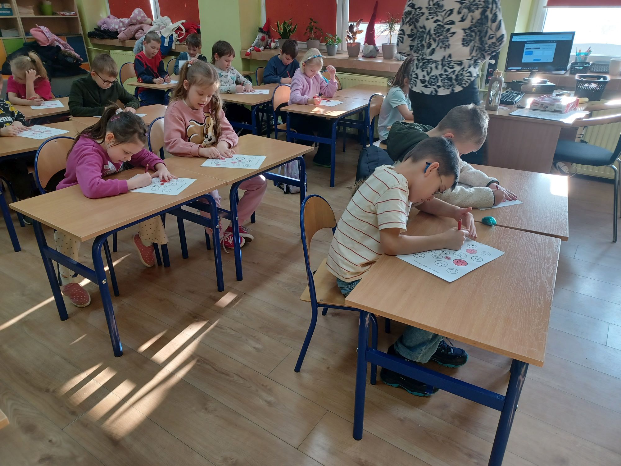 Środa upłynęła pod znakiem emocji, tańca i twórczości. Dzieci uczestniczyły w grach i zabawach psychologicznych „Poznajemy własne emocje!”, prowadzonych przez panią pedagog i psycholog. Brały również udział w warsztatach taneczno-ruchowych prowadzonych przez panią Magdalenę Nowak z Gminnego Centrum Kultury w Czersku oraz rozwijały zdolności manualne, dekorując podstawki techniką decoupage.
