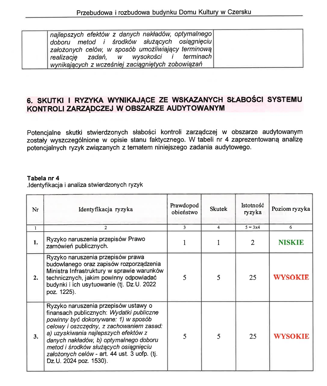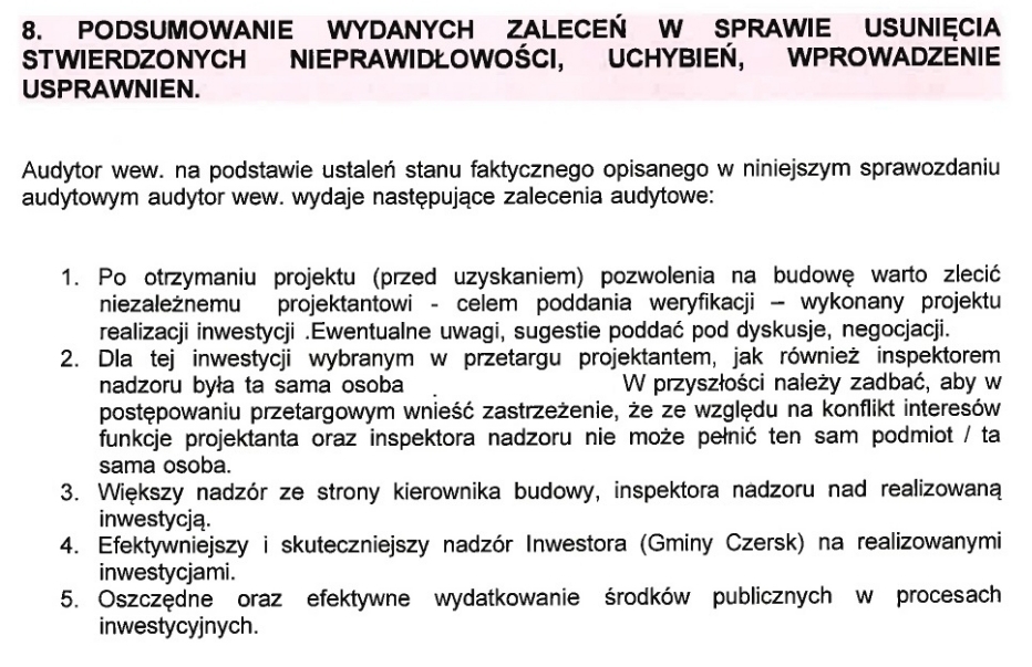 Audytor wew. stwierdza naruszenie zarówno przez projektanta jak również przez inspektora nadzoru inwestorskiego. Na podstawie ustaleń audytowych audytor wew. stwierdza, iż po stronie Inwestora ( Gminy Czersk) również wystąpiły nieprawidłowości w procesie przygotowania i prowadzenia procesu inwestycyjnego realizacji zadania o nazwie " Przebudowa i rozbudowa budynku Dom Kultury w Czersku". W opinii audytora wew. stwierdzone nieprawidłowości dotyczą:
