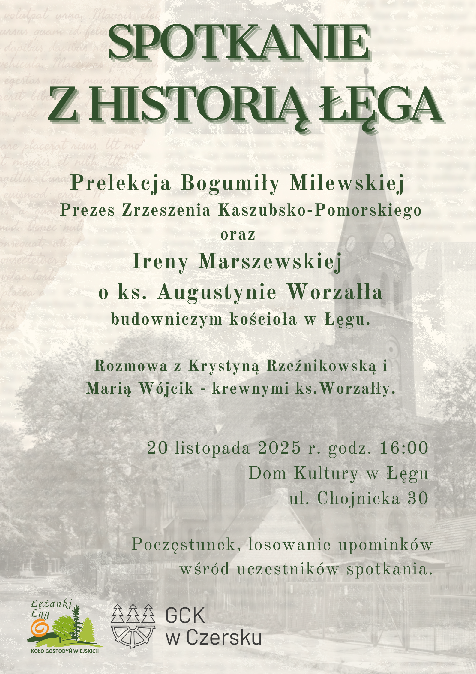 Zapraszamy na wyjątkowe, 6. już "Spotkanie z historią Łęga", które odbywa się w Domu Kultury w Łęgu z inicjatywy KGW "Łężanki".
