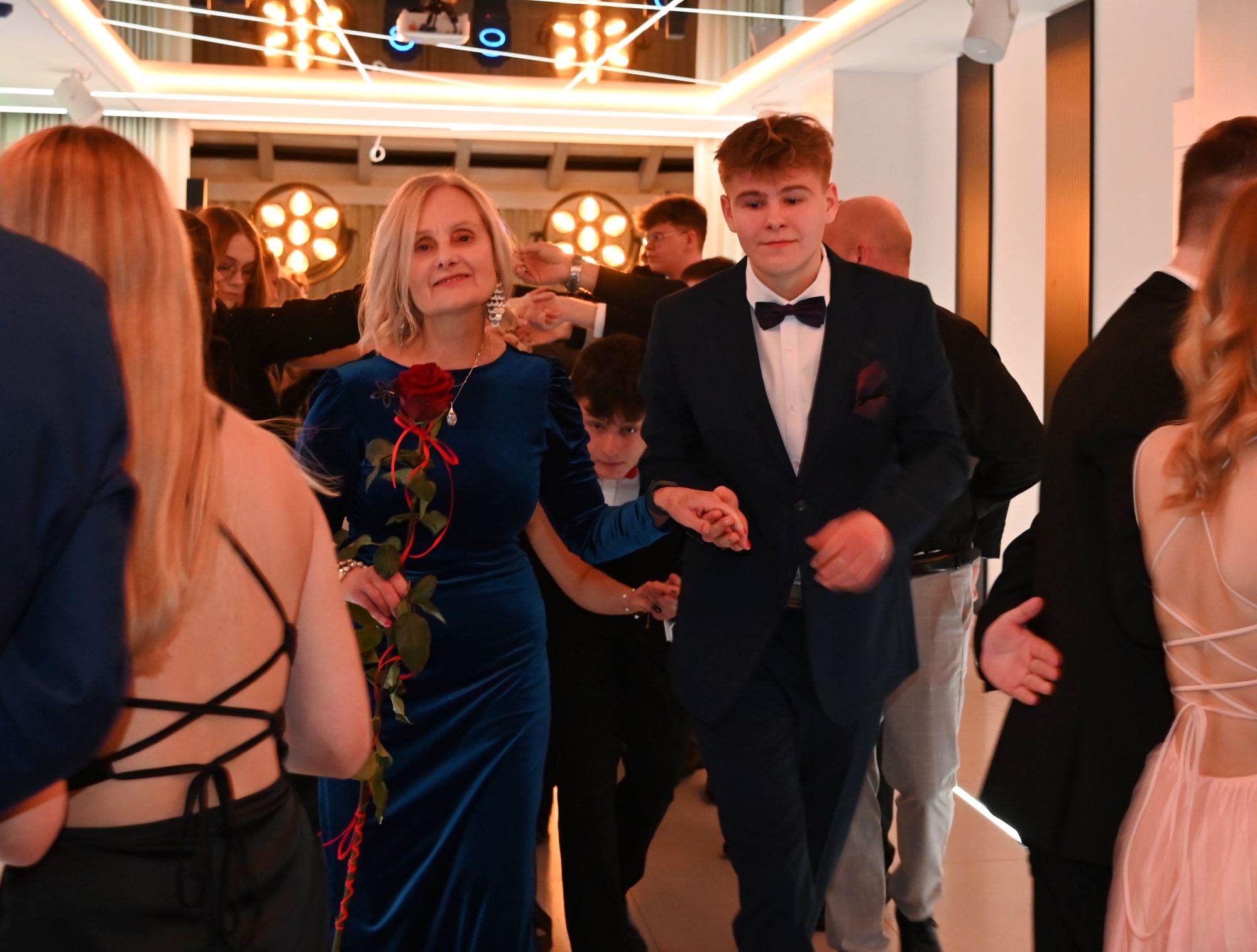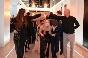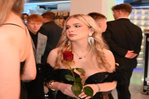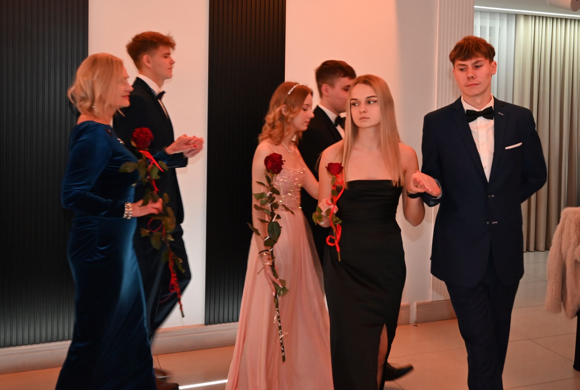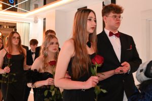 Paulina Wajdzik i Damian Urbański w imieniu całej klasy uroczyście powitali wszystkich uczestników Studniówki. Życzenia udanej zabawy, połączone z krótką retrospekcją z życia klasy piątej Technikum i jej wychowawczyni p. Iwony Chmielewskiej, złożyła dyrektor szkoły Elwira Bieszke-Binnebesel.