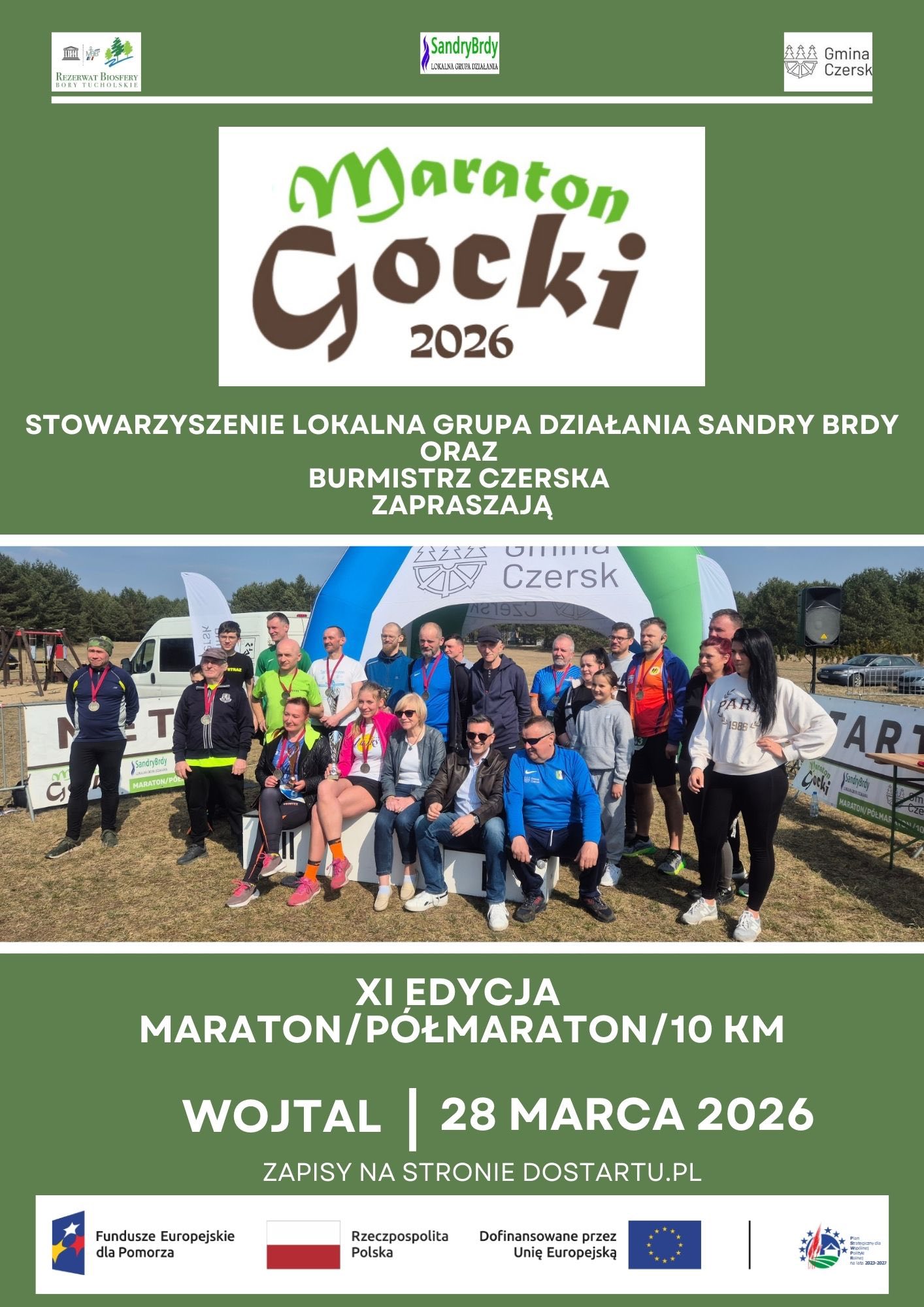 Lokalna Grupa Działania Sandry Brdy oraz Gmina Czersk serdecznie zapraszają w dniu 28.03.2026 r. do miejscowości Wojtal na wyjątkowe wydarzenie biegowe. Maraton, Półmaraton oraz bieg na dystansie 10 km na stałe wpisały się już w kalendarz imprez sportowych regionu.