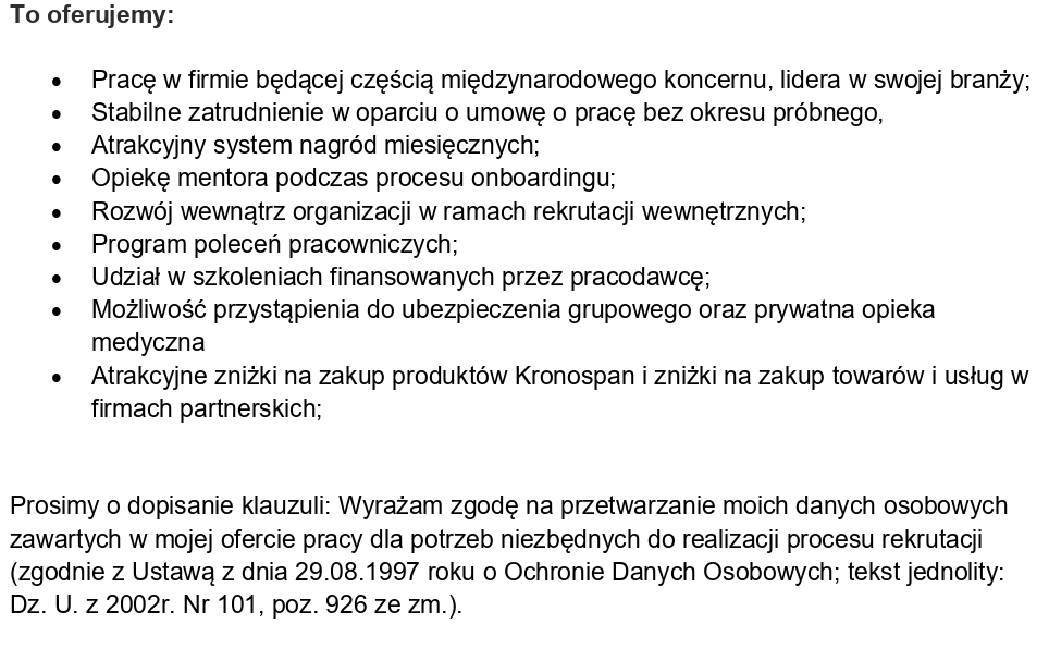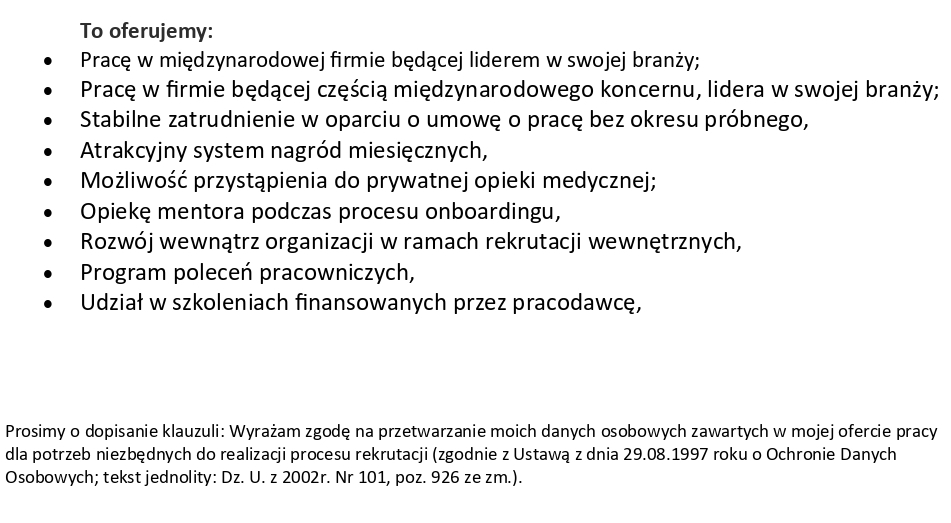 Prosimy o dopisanie klauzuli: Wyrażam zgodę na przetwarzanie moich danych osobowych zawartych w mojej ofercie pracy dla potrzeb niezbędnych do realizacji procesu rekrutacji (zgodnie z Ustawą z dnia 29.08.1997 roku o Ochronie Danych Osobowych; tekst jednolity: Dz. U. z 2002r. Nr 101, poz. 926 ze zm.).