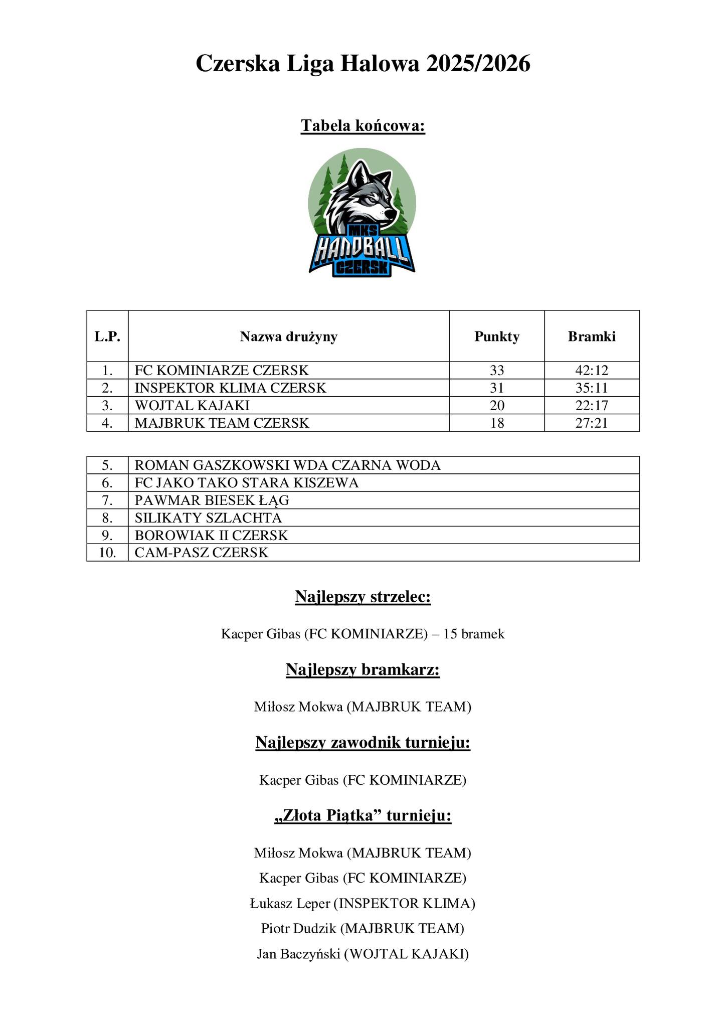 - Najlepszy zawodnik: Kacper Gibas (FC KOMINIARZE)
